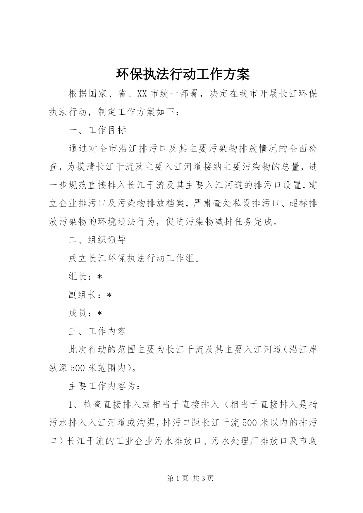 第PAGE\*Arabic\*MERGEFORMAT3页共NUMPAGES\*MERGEFORMAT3页环保执法行动工作方案根据国家、省、XX市统一部署,决定在我市开展长江环保执法行动,制定工作方案如下:一、工作目标通过对全市沿江排污口及其主要污染物排放情况的全面检查,为摸清长江干流及主要入江河道接纳主要污染物的总量,进一步规范直接排入长江干流及其主要入江河道的排污口设置,建立企业排污口及污染物排放档案,严肃查处私设排污口、超标排放污染物的环境违法行为,促进污染物减排任务完成。二、组织领导成立