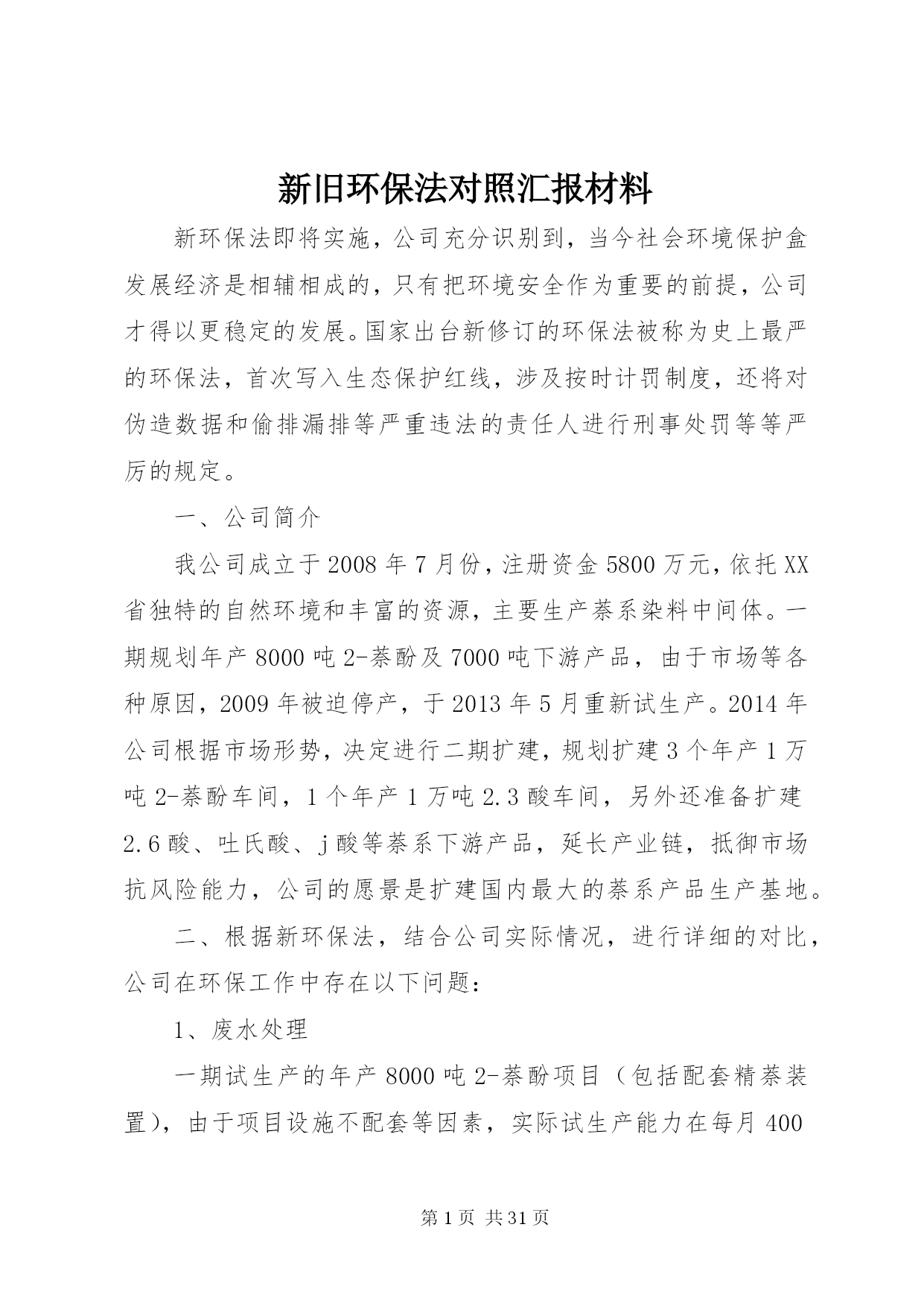 第PAGE\*Arabic\*MERGEFORMAT31页共NUMPAGES\*MERGEFORMAT31页新旧环保法对照汇报材料新环保法即将实施,公司充分识别到,当今社会环境保护盒发展经济是相辅相成的,只有把环境安全作为重要的前提,公司才得以更稳定的发展。国家出台新修订的环保法被称为史上最严的环保法,首次写入生态保护红线,涉及按时计罚制度,还将对伪造数据和偷排漏排等严重违法的责任人进行刑事处罚等等严厉的规定。一、公司简介我公司成立于2008年7月份,注册资金5800万元,依托XX省独特的自然