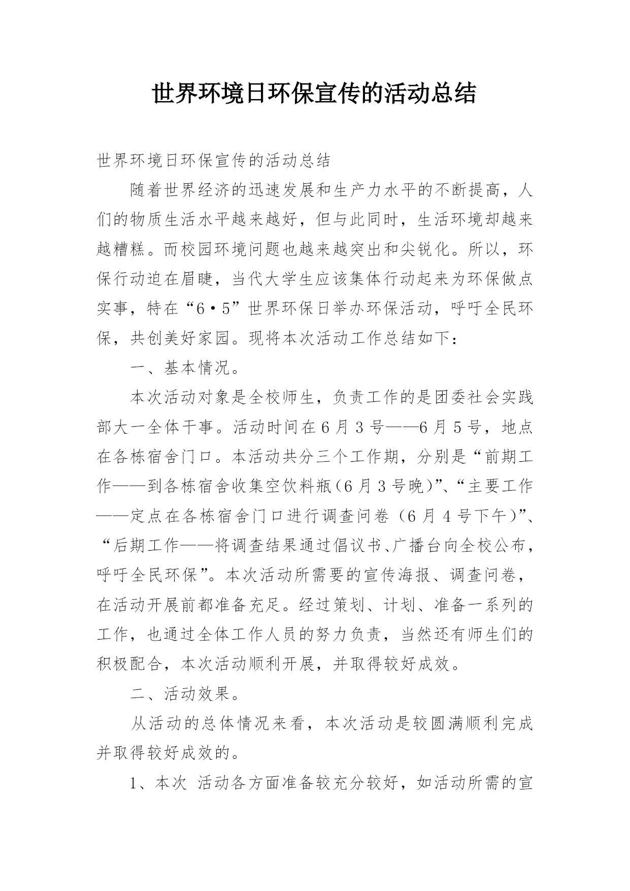 世界环境日环保宣传的活动总结世界环境日环保宣传的活动总结随着世界经济的迅速发展和生产力水平的不断提高,人们的物质生活水平越来越好,但与此同时,生活环境却越来越糟糕。而校园环境问题也越来越突出和尖锐化。所以,环保行动迫在眉睫,当代大学生应该集体行动起来为环保做点实事,特在“6·5”世界环保日举办环保活动,呼吁全民环保,共创美好家园。现将本次活动工作总结如下:一、基本情况。本次活动对象是全校师生,负责工作的是团委社会实践部大一全体干事。活动时间在6月3号——6月5号,地点在各栋宿舍门口。本活动共分三个工作期,