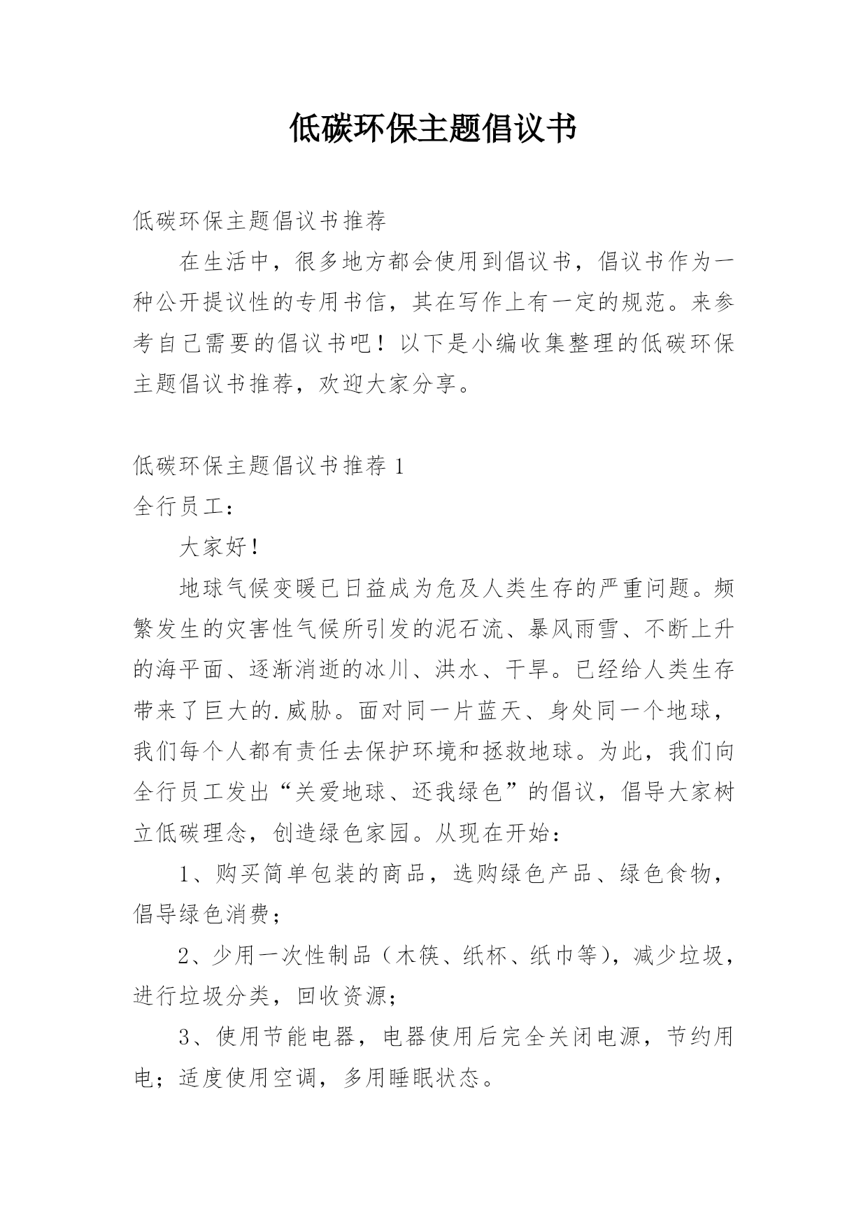 低碳环保主题倡议书低碳环保主题倡议书推荐在生活中,很多地方都会使用到倡议书,倡议书作为一种公开提议性的专用书信,其在写作上有一定的规范。来参考自己需要的倡议书吧!以下是小编收集整理的低碳环保主题倡议书推荐,欢迎大家分享。低碳环保主题倡议书推荐1全行员工:大家好!地球气候变暖已日益成为危及人类生存的严重问题。频繁发生的灾害性气候所引发的泥石流、暴风雨雪、不断上升的海平面、逐渐消逝的冰川、洪水、干旱。已经给人类生存带来了巨大的.威胁。面对同一片蓝天、身处同一个地球,我们每个人都有责任去保护环境和拯救地球。为此