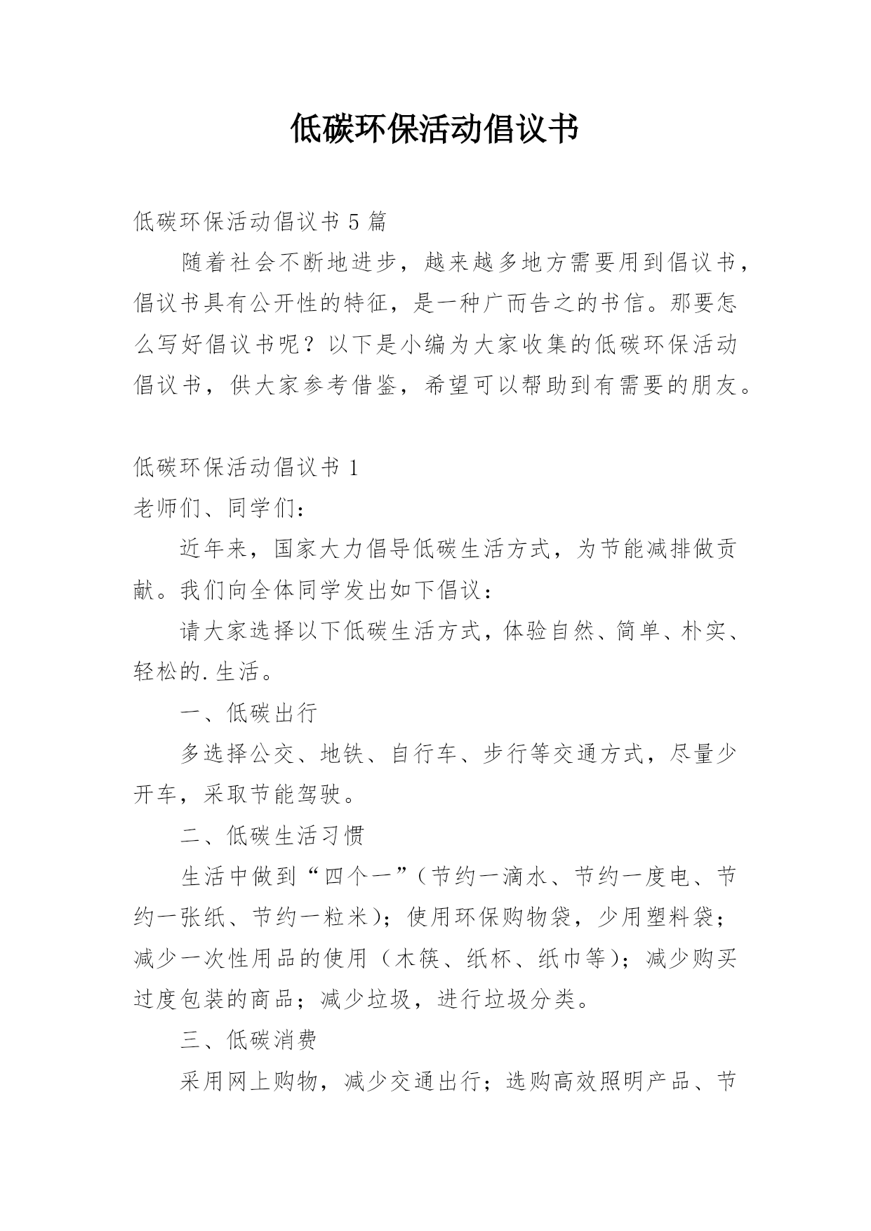 低碳环保活动倡议书低碳环保活动倡议书5篇随着社会不断地进步,越来越多地方需要用到倡议书,倡议书具有公开性的特征,是一种广而告之的书信。那要怎么写好倡议书呢?以下是小编为大家收集的低碳环保活动倡议书,供大家参考借鉴,希望可以帮助到有需要的朋友。低碳环保活动倡议书1老师们、同学们:近年来,国家大力倡导低碳生活方式,为节能减排做贡献。我们向全体同学发出如下倡议:请大家选择以下低碳生活方式,体验自然、简单、朴实、轻松的.生活。一、低碳出行多选择公交、地铁、自行车、步行等交通方式,尽量少开车,采取节能驾驶。二、低碳