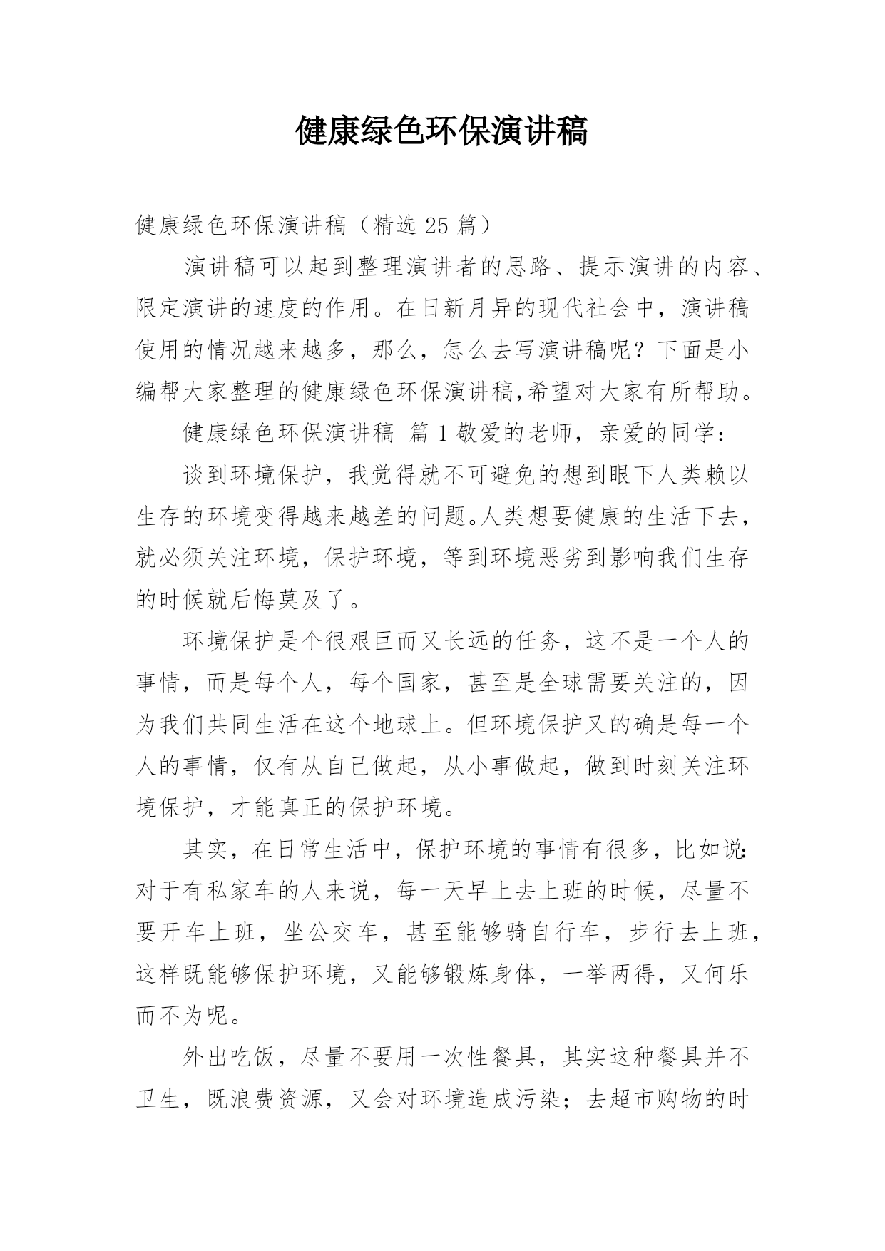健康绿色环保演讲稿健康绿色环保演讲稿(精选25篇)演讲稿可以起到整理演讲者的思路、提示演讲的内容、限定演讲的速度的作用。在日新月异的现代社会中,演讲稿使用的情况越来越多,那么,怎么去写演讲稿呢?下面是小编帮大家整理的健康绿色环保演讲稿,希望对大家有所帮助。健康绿色环保演讲稿篇1敬爱的老师,亲爱的同学:谈到环境保护,我觉得就不可避免的想到眼下人类赖以生存的环境变得越来越差的问题。人类想要健康的生活下去,就必须关注环境,保护环境,等到环境恶劣到影响我们生存的时候就后悔莫及了。环境保护是个很艰巨而又长远的任务,