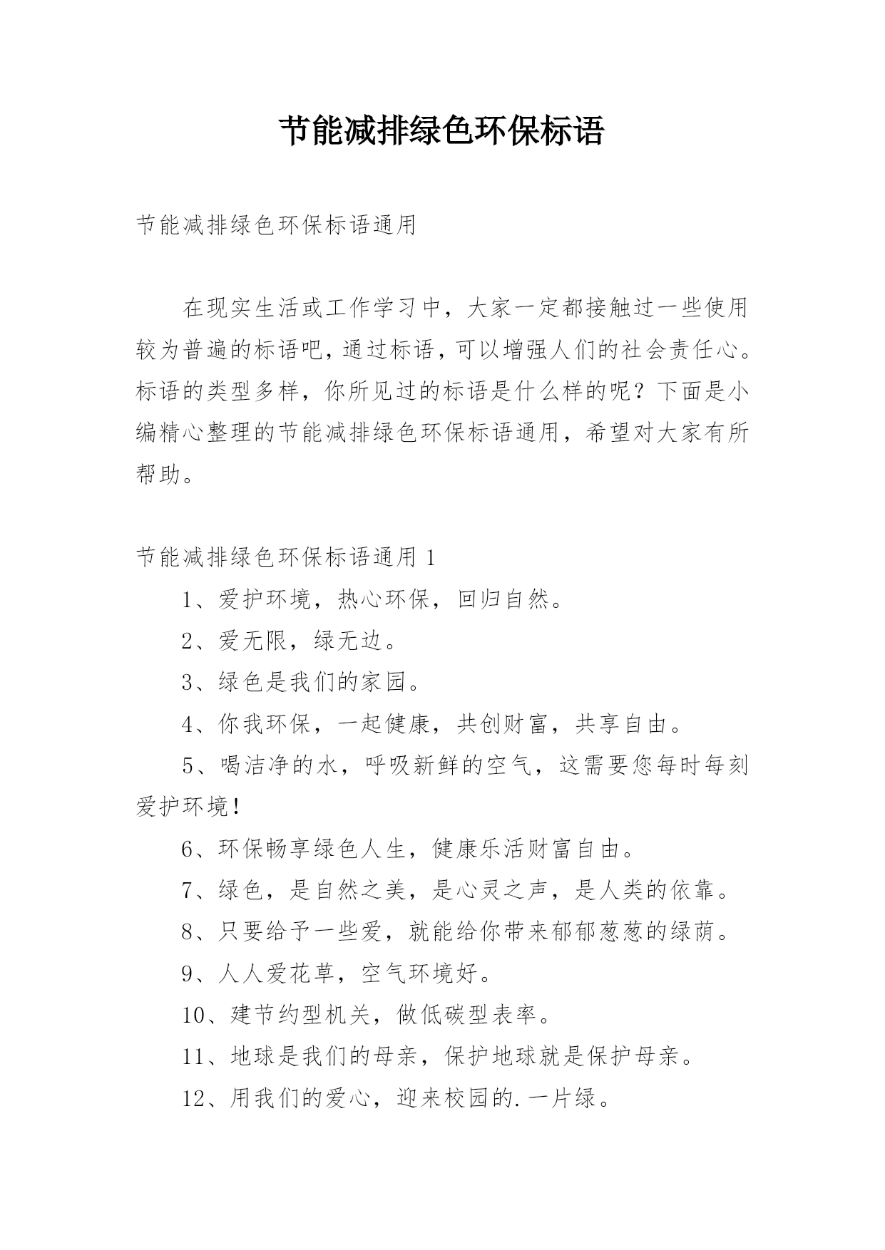 节能减排绿色环保标语节能减排绿色环保标语通用在现实生活或工作学习中,大家一定都接触过一些使用较为普遍的标语吧,通过标语,可以增强人们的社会责任心。标语的类型多样,你所见过的标语是什么样的呢?下面是小编精心整理的节能减排绿色环保标语通用,希望对大家有所帮助。节能减排绿色环保标语通用11、爱护环境,热心环保,回归自然。2、爱无限,绿无边。3、绿色是我们的家园。4、你我环保,一起健康,共创财富,共享自由。5、喝洁净的水,呼吸新鲜的空气,这需要您每时每刻爱护环境!6、环保畅享绿色人生,健康乐活财富自由。7、绿色,