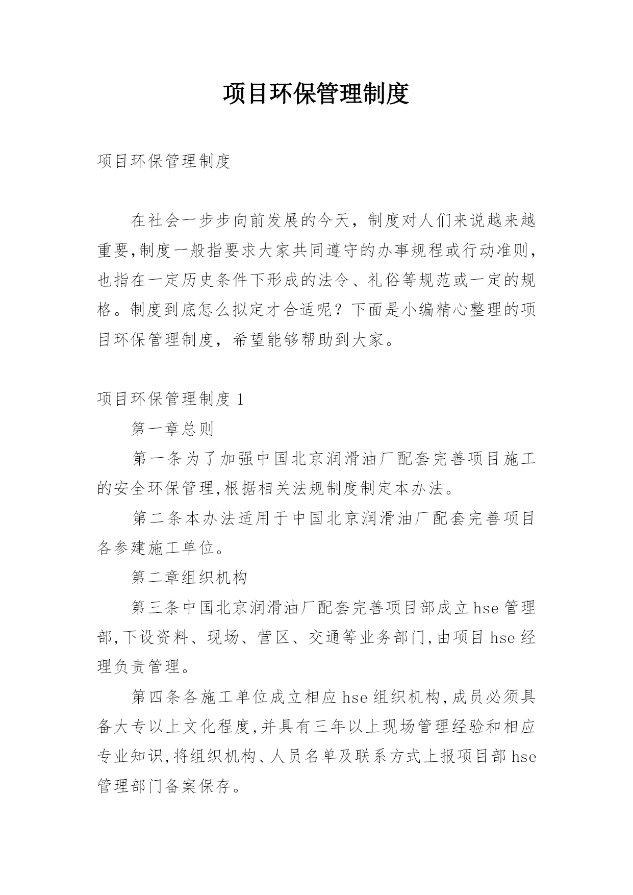 项目环保管理制度项目环保管理制度在社会一步步向前发展的今天,制度对人们来说越来越重要,制度一般指要求大家共同遵守的办事规程或行动准则,也指在一定历史条件下形成的法令、礼俗等规范或一定的规格。制度到底怎么拟定才合适呢?下面是小编精心整理的项目环保管理制度,希望能够帮助到大家。项目环保管理制度1第一章总则第一条为了加强中国北京润滑油厂配套完善项目施工的安全环保管理,根据相关法规制度制定本办法。第二条本办法适用于中国北京润滑油厂配套完善项目各参建施工单位。第二章组织机构第三条中国北京润滑油厂配套完善项目部成立h