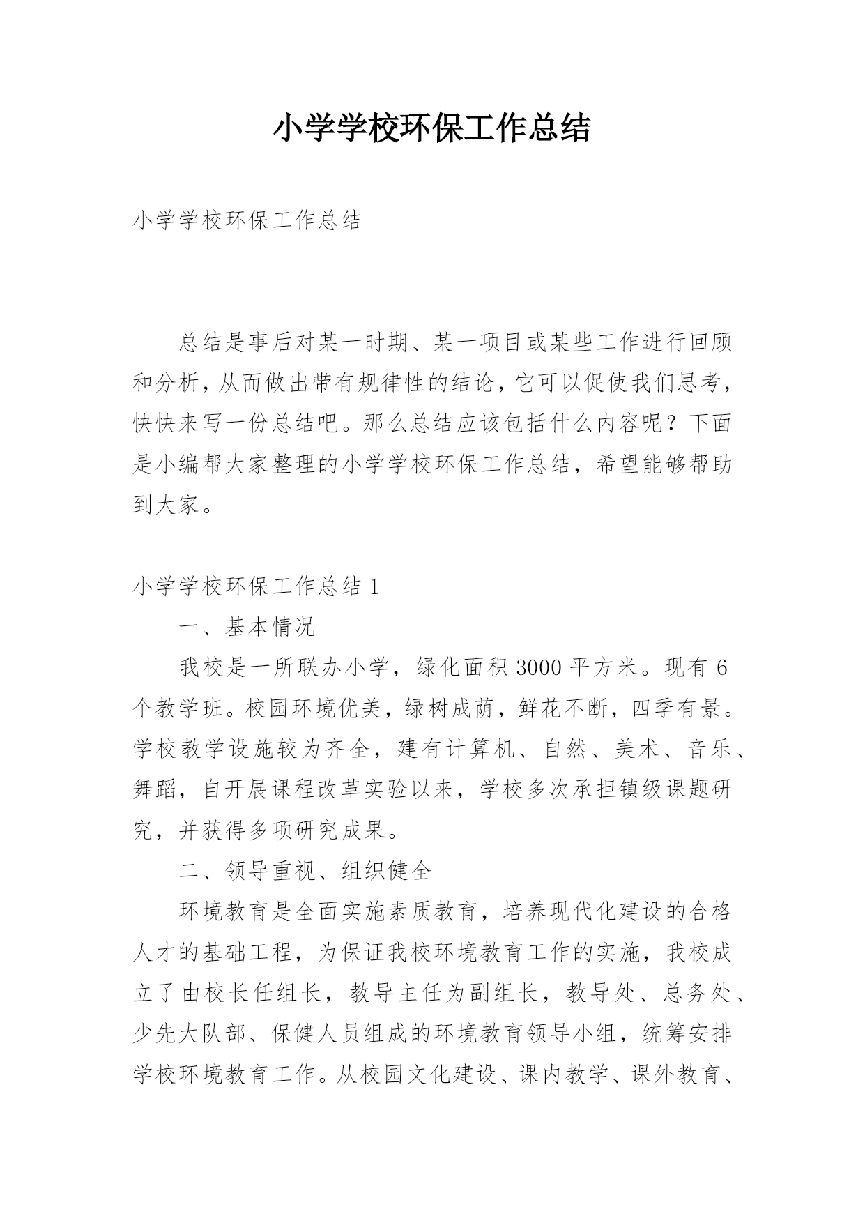 小学学校环保工作总结小学学校环保工作总结总结是事后对某一时期、某一项目或某些工作进行回顾和分析,从而做出带有规律性的结论,它可以促使我们思考,快快来写一份总结吧。那么总结应该包括什么内容呢?下面是小编帮大家整理的小学学校环保工作总结,希望能够帮助到大家。小学学校环保工作总结1一、基本情况我校是一所联办小学,绿化面积3000平方米。现有6个教学班。校园环境优美,绿树成荫,鲜花不断,四季有景。学校教学设施较为齐全,建有计算机、自然、美术、音乐、舞蹈,自开展课程改革实验以来,学校多次承担镇级课题研究,并获得多项