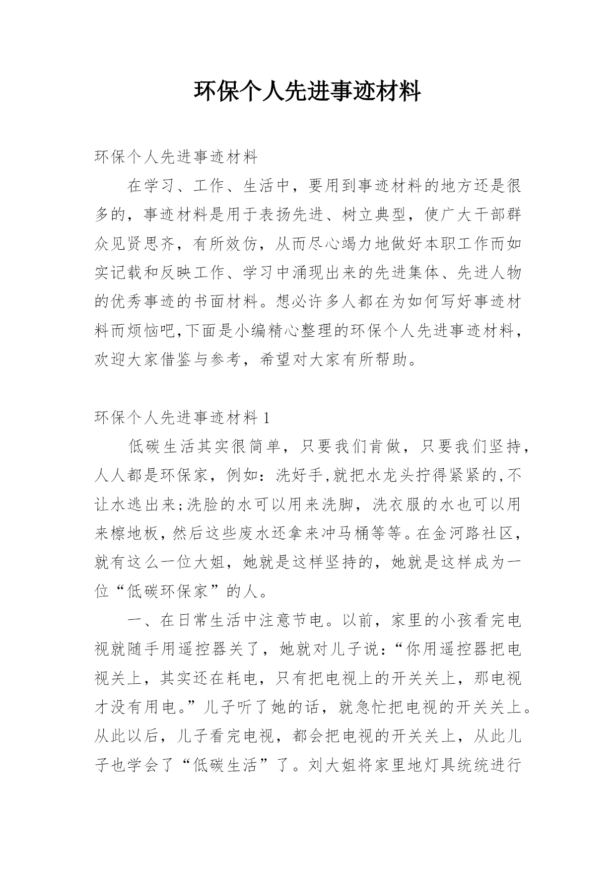 环保个人先进事迹材料环保个人先进事迹材料在学习、工作、生活中,要用到事迹材料的地方还是很多的,事迹材料是用于表扬先进、树立典型,使广大干部群众见贤思齐,有所效仿,从而尽心竭力地做好本职工作而如实记载和反映工作、学习中涌现出来的先进集体、先进人物的优秀事迹的书面材料。想必许多人都在为如何写好事迹材料而烦恼吧,下面是小编精心整理的环保个人先进事迹材料,欢迎大家借鉴与参考,希望对大家有所帮助。环保个人先进事迹材料1低碳生活其实很简单,只要我们肯做,只要我们坚持,人人都是环保家,例如:洗好手,就把水龙头拧得紧紧的