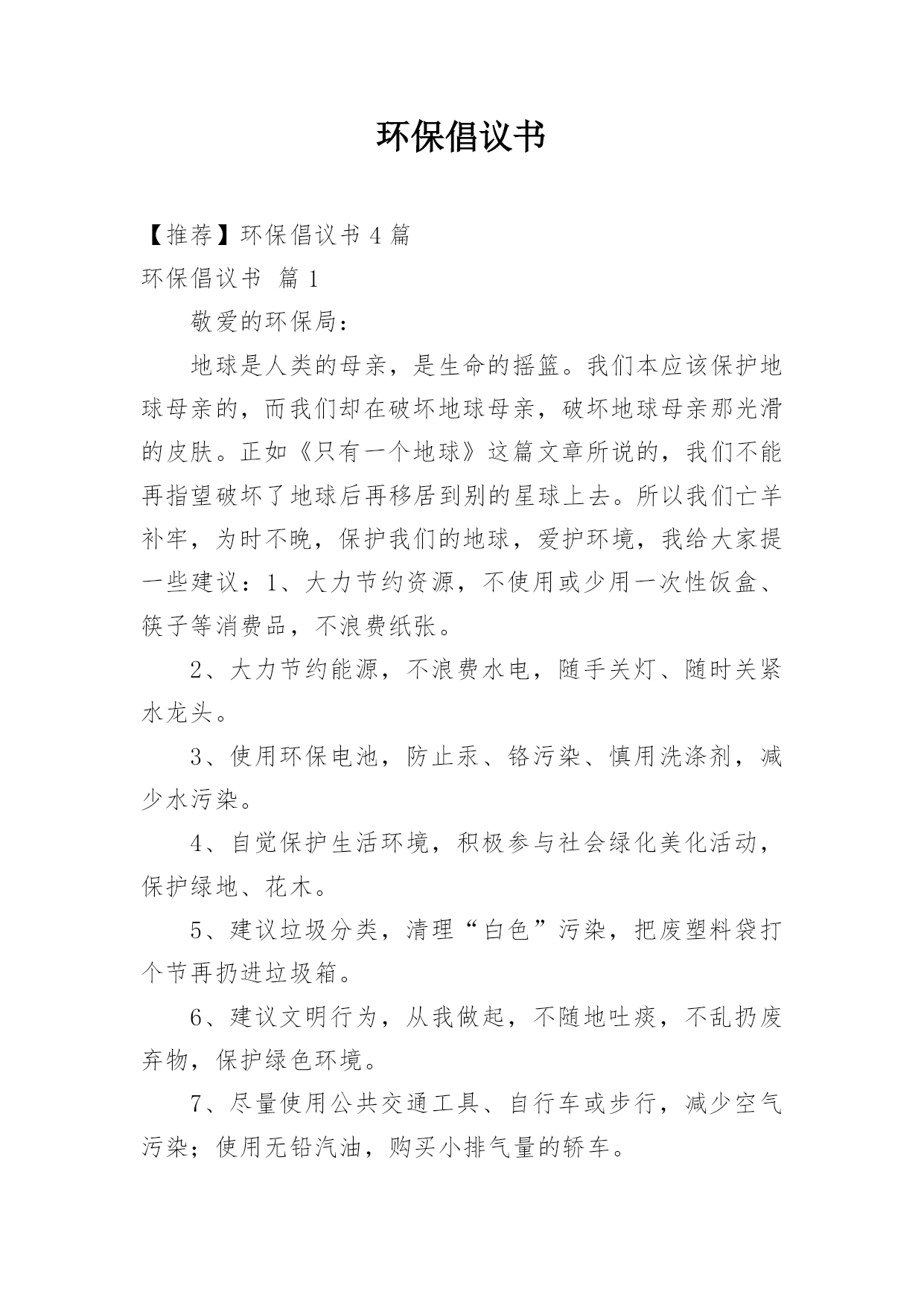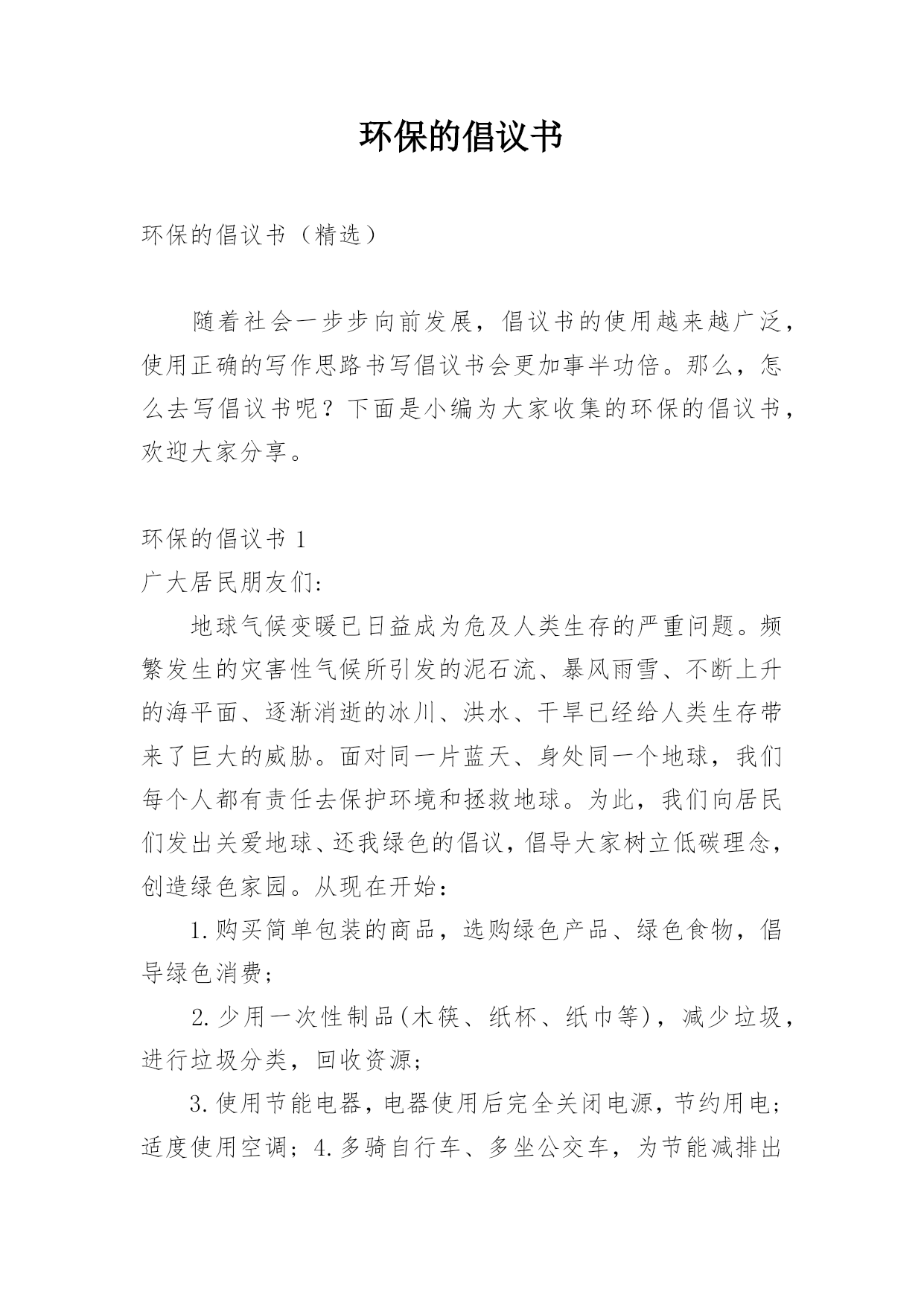 环保的倡议书环保的倡议书(精选)随着社会一步步向前发展,倡议书的使用越来越广泛,使用正确的写作思路书写倡议书会更加事半功倍。那么,怎么去写倡议书呢?下面是小编为大家收集的环保的倡议书,欢迎大家分享。环保的倡议书1广大居民朋友们:地球气候变暖已日益成为危及人类生存的严重问题。频繁发生的灾害性气候所引发的泥石流、暴风雨雪、不断上升的海平面、逐渐消逝的冰川、洪水、干旱已经给人类生存带来了巨大的威胁。面对同一片蓝天、身处同一个地球,我们每个人都有责任去保护环境和拯救地球。为此,我们向居民们发出关爱地球、还我绿色的