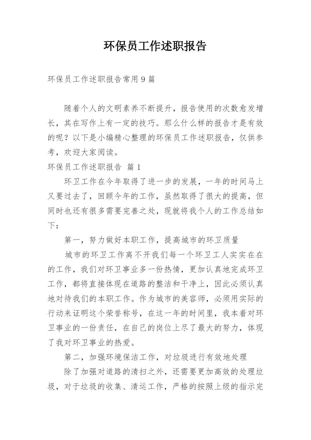 环保员工作述职报告环保员工作述职报告常用9篇随着个人的文明素养不断提升,报告使用的次数愈发增长,其在写作上有一定的技巧。那么什么样的报告才是有效的呢?以下是小编精心整理的环保员工作述职报告,仅供参考,欢迎大家阅读。环保员工作述职报告篇1环卫工作在今年取得了进一步的发展,一年的时间马上又要过去了,回顾今年的工作,虽然取得了很大的提高,但同时也还有很多需要完善之处,现就将我个人的工作总结如下:第一,努力做好本职工作,提高城市的环卫质量城市的环卫工作离不开我们每一个环卫工人实实在在的工作,我们对环卫事业多一份热