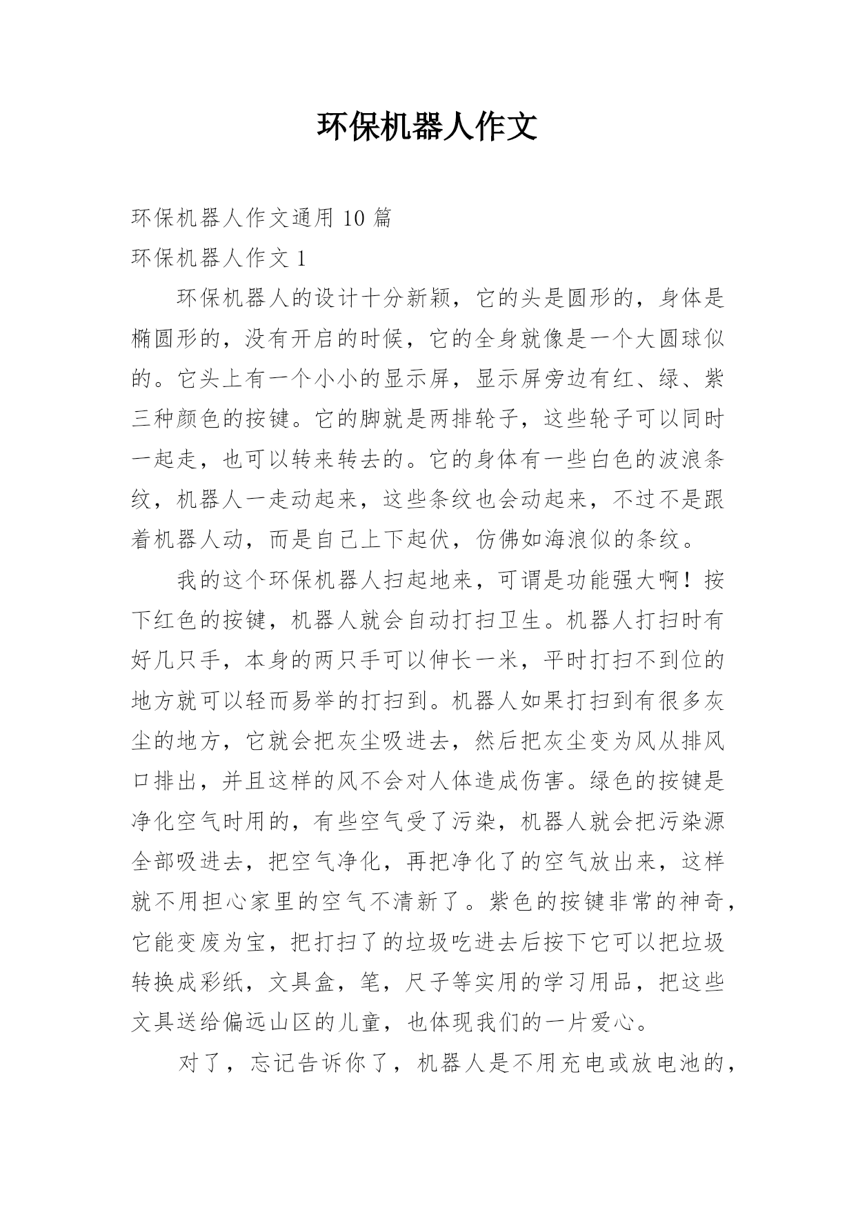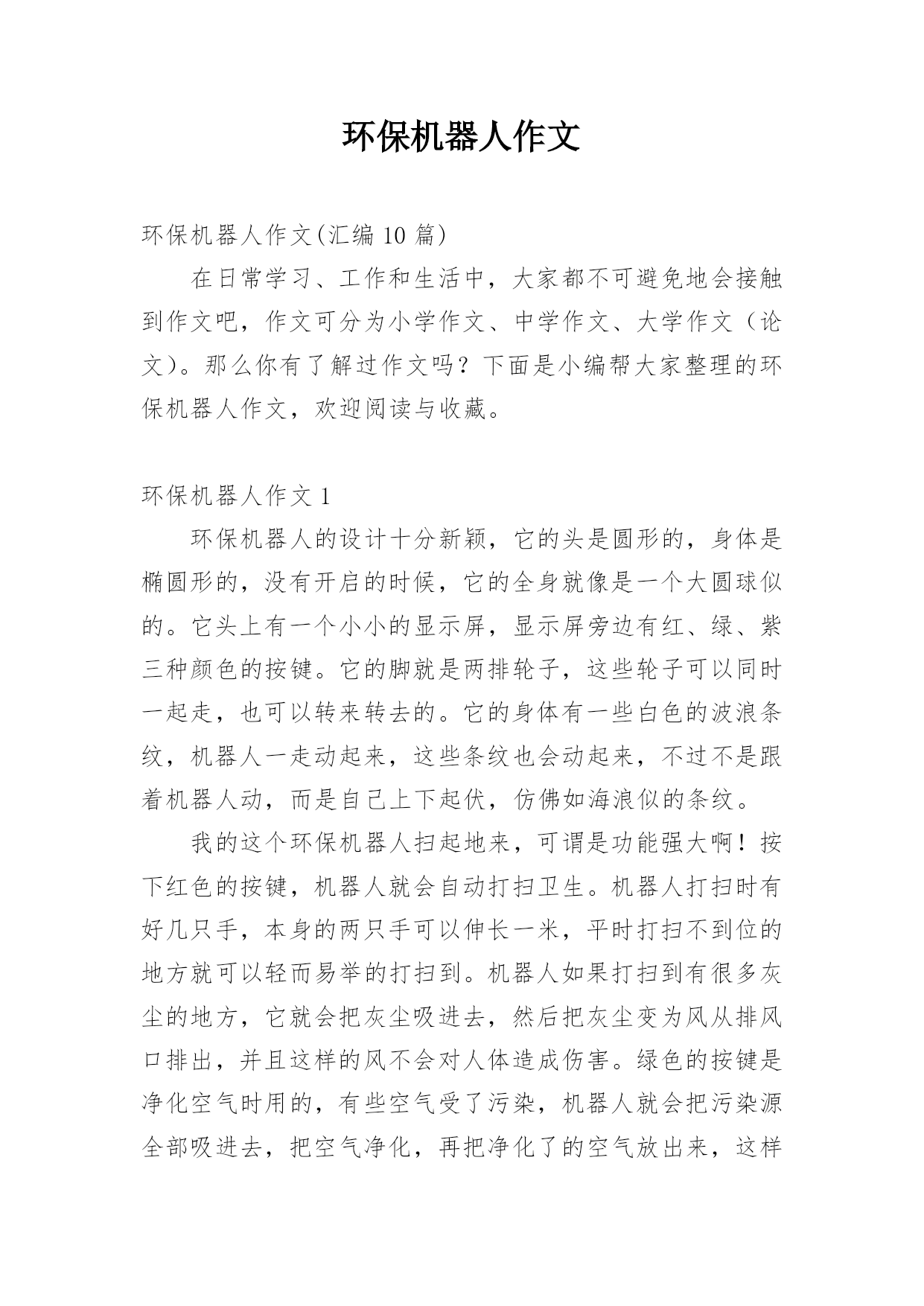 环保机器人作文环保机器人作文(汇编10篇)在日常学习、工作和生活中,大家都不可避免地会接触到作文吧,作文可分为小学作文、中学作文、大学作文(论文)。那么你有了解过作文吗?下面是小编帮大家整理的环保机器人作文,欢迎阅读与收藏。环保机器人作文1环保机器人的设计十分新颖,它的头是圆形的,身体是椭圆形的,没有开启的时候,它的全身就像是一个大圆球似的。它头上有一个小小的显示屏,显示屏旁边有红、绿、紫三种颜色的按键。它的脚就是两排轮子,这些轮子可以同时一起走,也可以转来转去的。它的身体有一些白色的波浪条纹,机器人一走