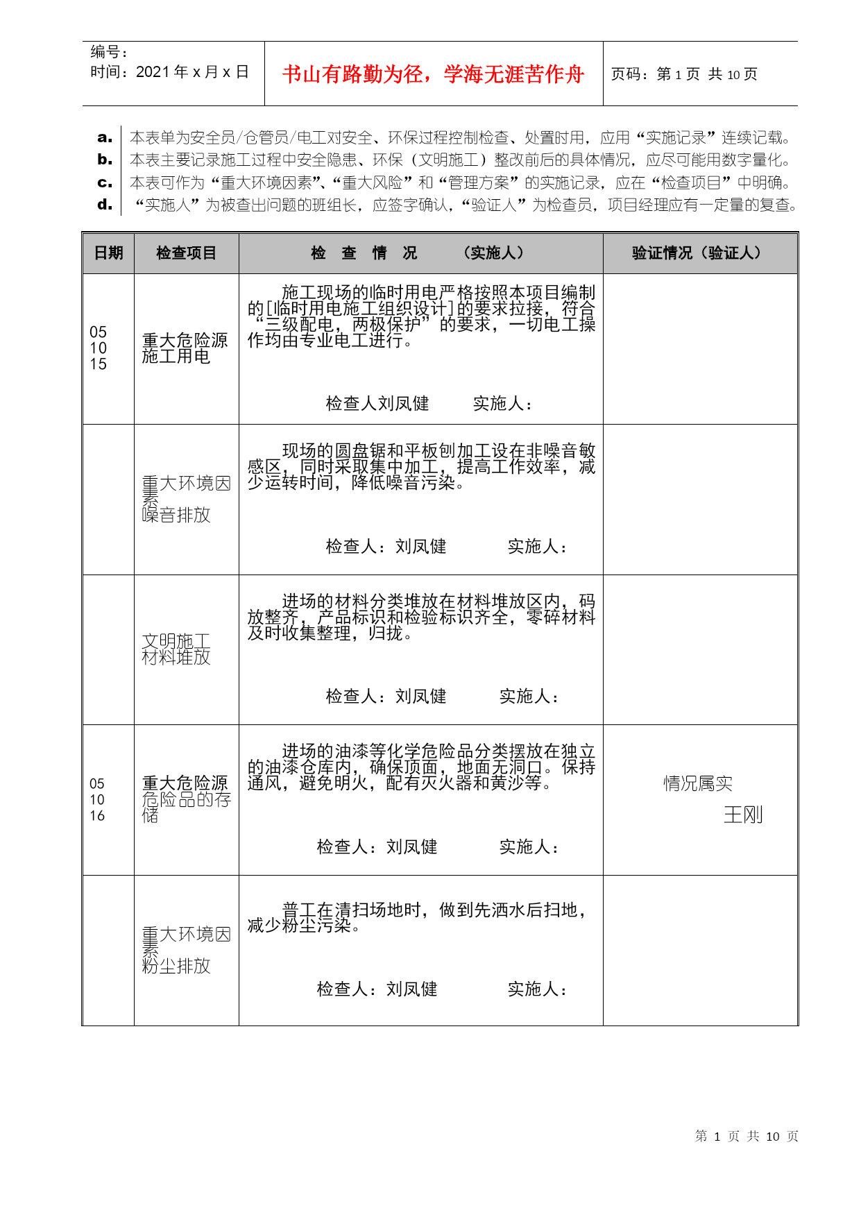 编号:时间:2021年x月x日书山有路勤为径,学海无涯苦作舟页码:第PAGE10页共NUMPAGES10页第PAGE\*MERGEFORMAT10页共NUMPAGES\*MERGEFORMAT10页本表单为安全员/仓管员/电工对安全、环保过程控制检查、处置时用,应用“实施记录”连续记载。本表主要记录施工过程中安全隐患、环保(文明施工)整改前后的具体情况,应尽可能用数字量化。本表可作为“重大环境因素”、“重大风险”和“管理方案”的实施记录,应在“检查项目”中明确。“实施人”为被查出问
