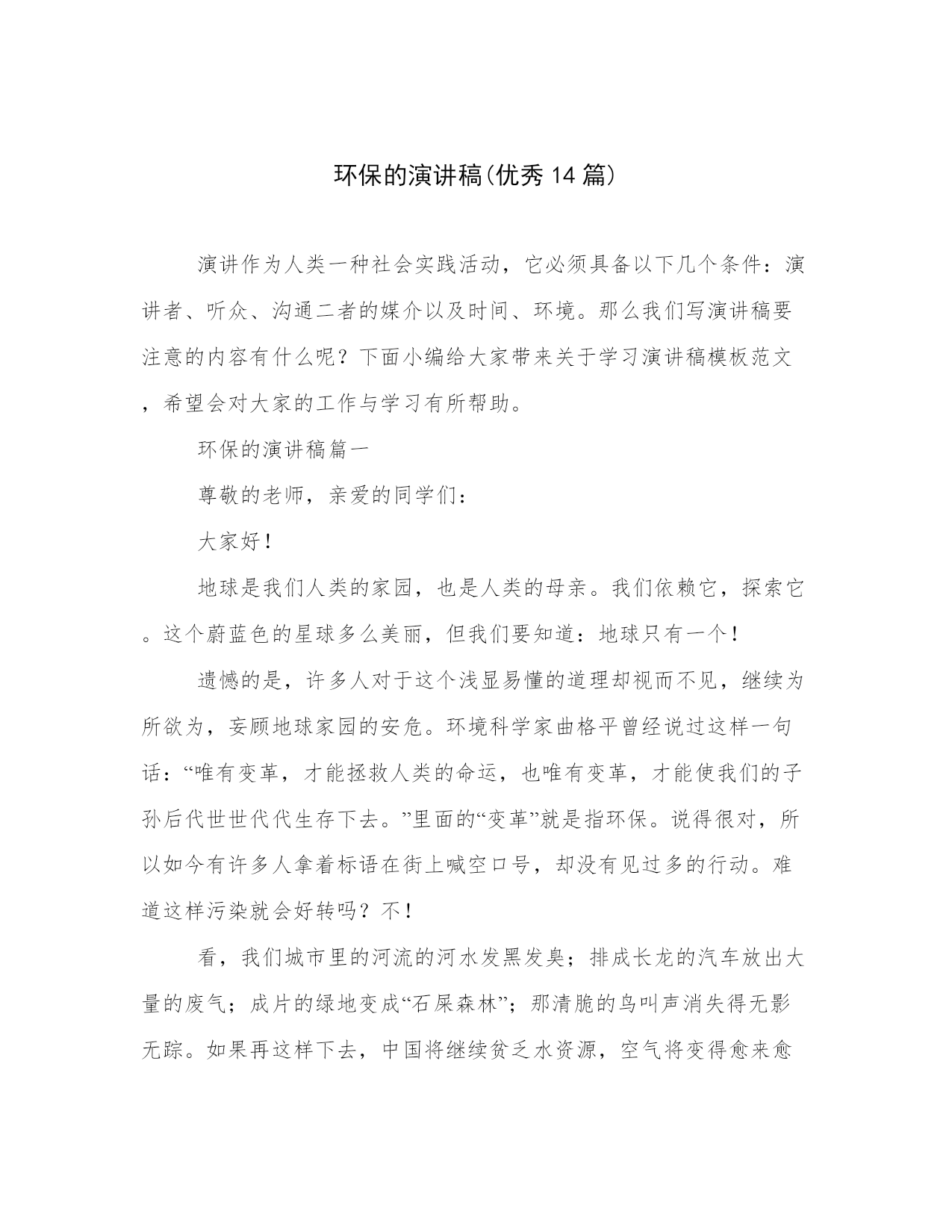 环保的演讲稿(优秀14篇)演讲作为人类一种社会实践活动,它必须具备以下几个条件:演讲者、听众、沟通二者的媒介以及时间、环境。那么我们写演讲稿要注意的内容有什么呢?下面小编给大家带来关于学习演讲稿模板范文,希望会对大家的工作与学习有所帮助。环保的演讲稿篇一尊敬的老师,亲爱的同学们:大家好!地球是我们人类的家园,也是人类的母亲。我们依赖它,探索它。这个蔚蓝色的星球多么美丽,但我们要知道:地球只有一个!遗憾的是,许多人对于这个浅显易懂的道理却视而不见,继续为所欲为,妄顾地球家园的安危。环境科学家曲格平曾经说过这