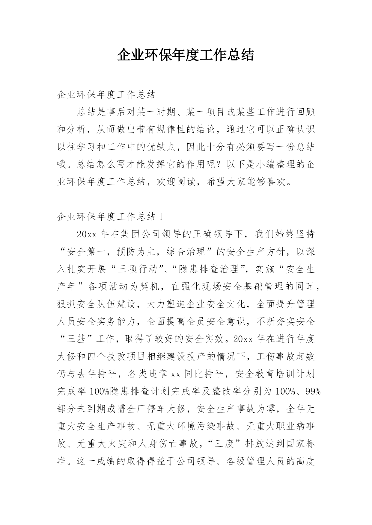 企业环保年度工作总结企业环保年度工作总结总结是事后对某一时期、某一项目或某些工作进行回顾和分析,从而做出带有规律性的结论,通过它可以正确认识以往学习和工作中的优缺点,因此十分有必须要写一份总结哦。总结怎么写才能发挥它的作用呢?以下是小编整理的企业环保年度工作总结,欢迎阅读,希望大家能够喜欢。企业环保年度工作总结120xx年在集团公司领导的正确领导下,我们始终坚持“安全第一,预防为主,综合治理”的安全生产方针,以深入扎实开展“三项行动”、“隐患排查治理”,实施“安全生产年”各项活动为契机,在强化现场安全基础