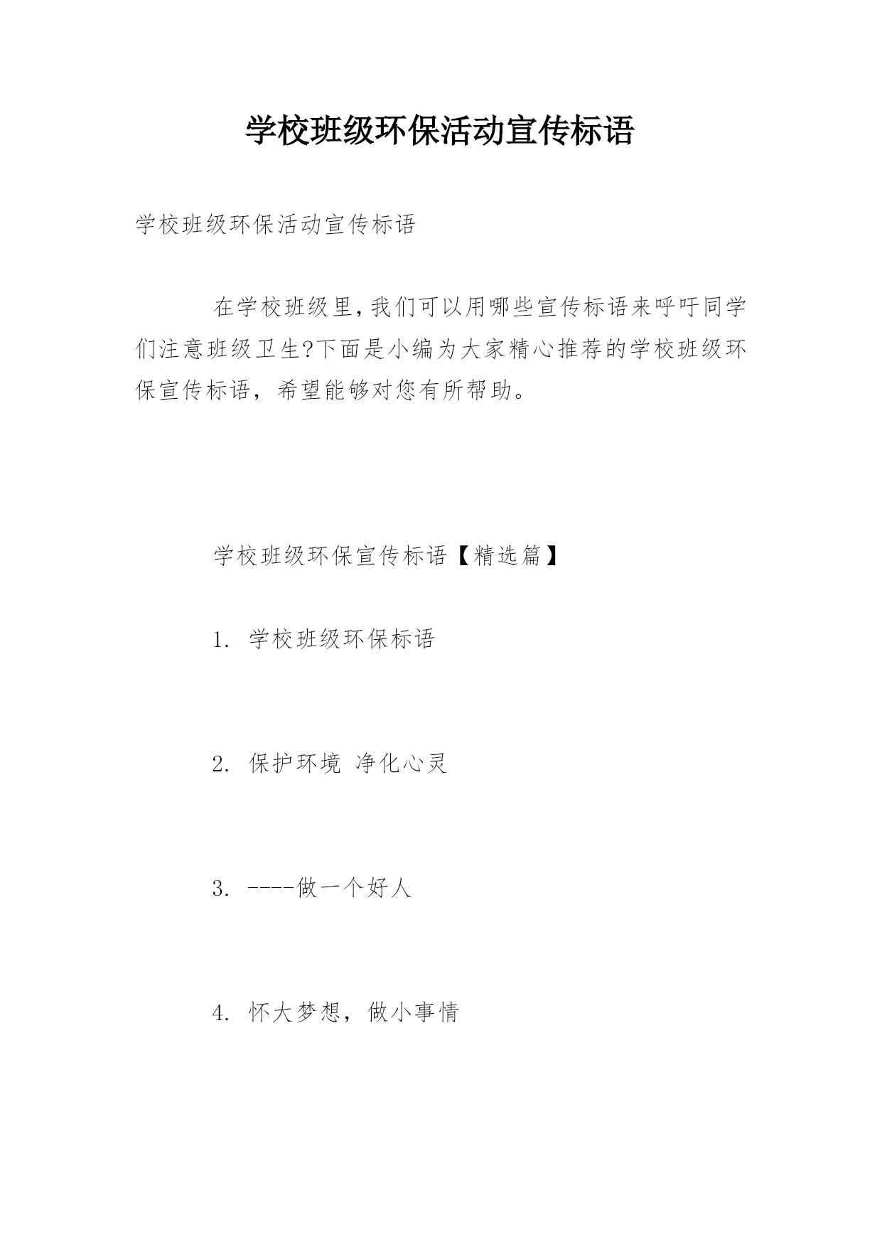 学校班级环保活动宣传标语学校班级环保活动宣传标语在学校班级里,我们可以用哪些宣传标语来呼吁同学们注意班级卫生?下面是小编为大家精心推荐的学校班级环保宣传标语,希望能够对您有所帮助。学校班级环保宣传标语【精选篇】1.学校班级环保标语2.保护环境净化心灵3.----做一个好人4.怀大梦想,做小事情5.手边留情,脚下留净。6.明净之道,何忍污之。7.百年校园,静净尽显。8.绿草青青,足下留情。9.绿色守望者守望绿色10.我们是自然界的一部分11.勿让垃圾在窗外自由落体12.科技的`阶梯,环保的楼梯13.举手做环