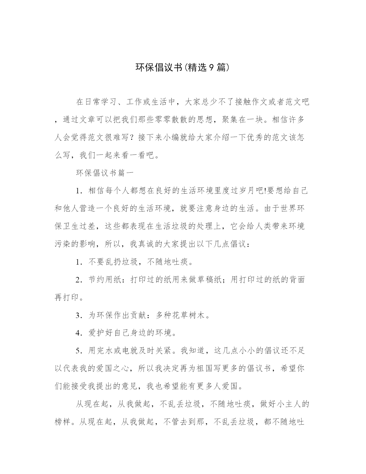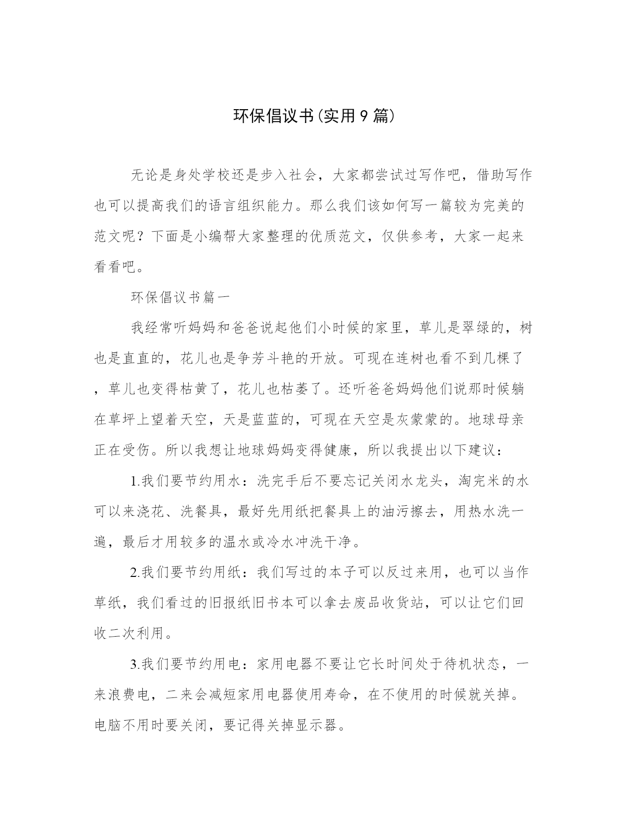 环保倡议书(精选9篇)在日常学习、工作或生活中,大家总少不了接触作文或者范文吧,通过文章可以把我们那些零零散散的思想,聚集在一块。相信许多人会觉得范文很难写?接下来小编就给大家介绍一下优秀的范文该怎么写,我们一起来看一看吧。环保倡议书篇一1.相信每个人都想在良好的生活环境里度过岁月吧!要想给自己和他人营造一个良好的生活环境,就要注意身边的生活。由于世界环保卫生过差,这些都表现在生活垃圾的处理上,它会给人类带来环境污染的影响,所以,我真诚的大家提出以下几点倡议:1.不要乱扔垃圾,不随地吐痰。2.节约用纸:打