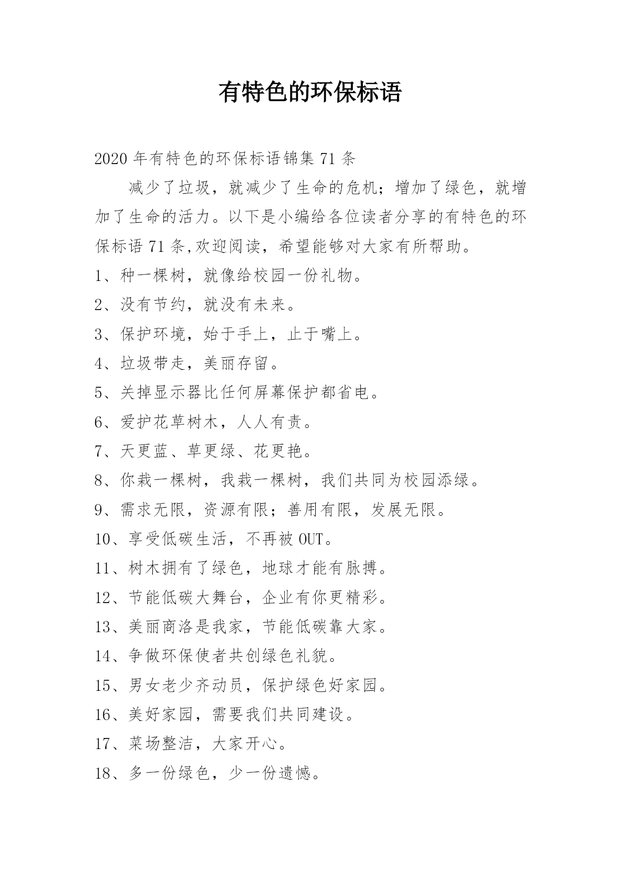 有特色的环保标语2020年有特色的环保标语锦集71条减少了垃圾,就减少了生命的危机;增加了绿色,就增加了生命的活力。以下是小编给各位读者分享的有特色的环保标语71条,欢迎阅读,希望能够对大家有所帮助。1、种一棵树,就像给校园一份礼物。2、没有节约,就没有未来。3、保护环境,始于手上,止于嘴上。4、垃圾带走,美丽存留。5、关掉显示器比任何屏幕保护都省电。6、爱护花草树木,人人有责。7、天更蓝、草更绿、花更艳。8、你栽一棵树,我栽一棵树,我们共同为校园添绿。9、需求无限,资源有限;善用有限,发展无限。10、享