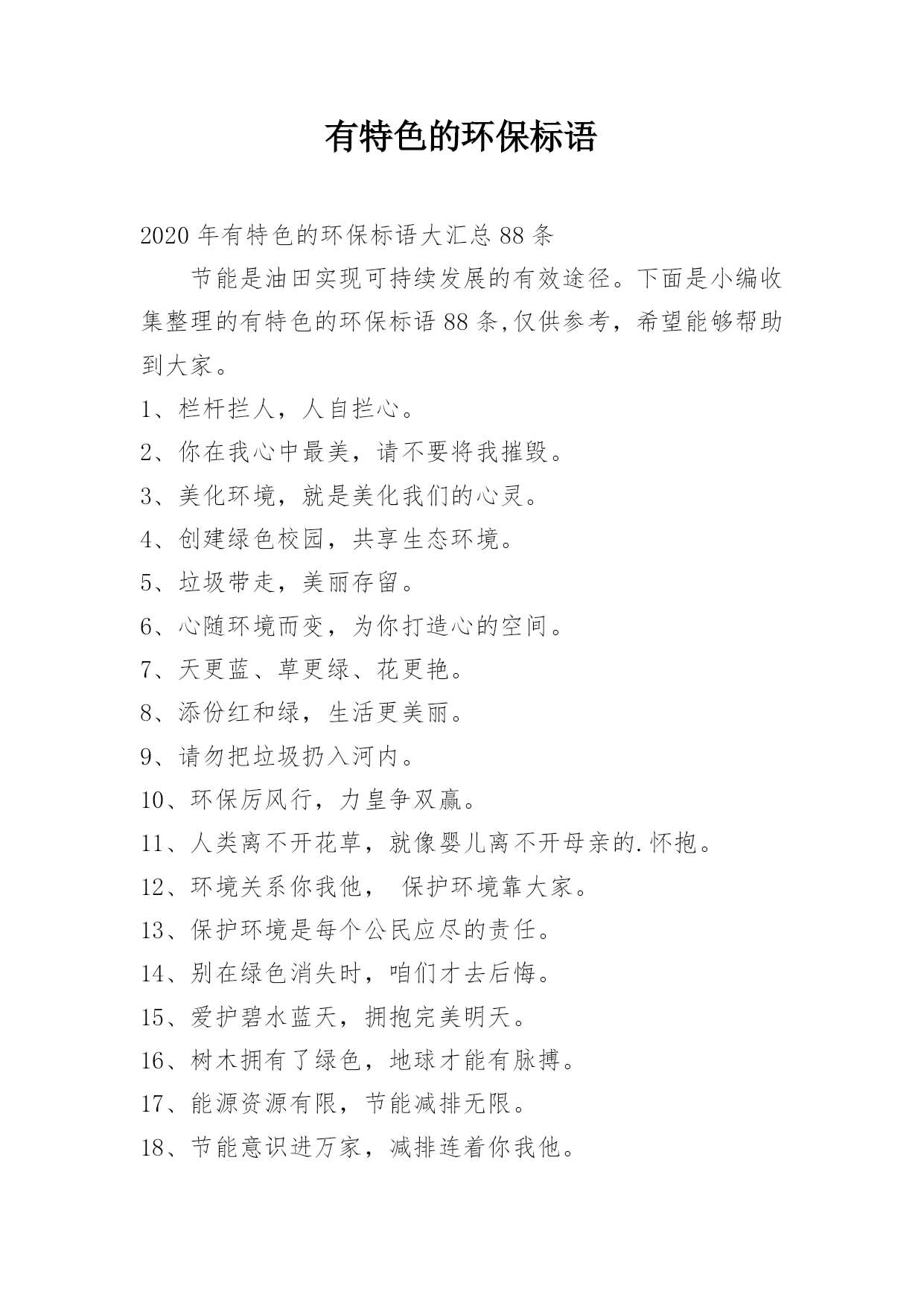 有特色的环保标语2020年有特色的环保标语大汇总88条节能是油田实现可持续发展的有效途径。下面是小编收集整理的有特色的环保标语88条,仅供参考,希望能够帮助到大家。1、栏杆拦人,人自拦心。2、你在我心中最美,请不要将我摧毁。3、美化环境,就是美化我们的心灵。4、创建绿色校园,共享生态环境。5、垃圾带走,美丽存留。6、心随环境而变,为你打造心的空间。7、天更蓝、草更绿、花更艳。8、添份红和绿,生活更美丽。9、请勿把垃圾扔入河内。10、环保厉风行,力皇争双赢。11、人类离不开花草,就像婴儿离不开母亲的.怀抱。