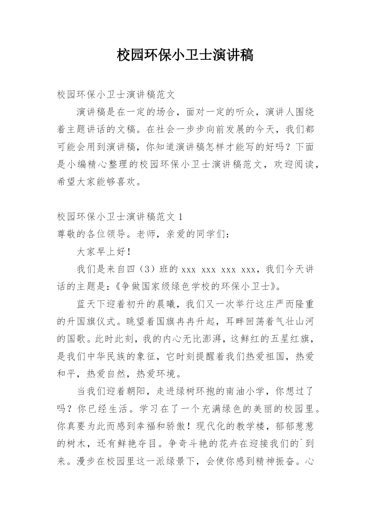 校园环保小卫士演讲稿校园环保小卫士演讲稿范文演讲稿是在一定的场合,面对一定的听众,演讲人围绕着主题讲话的文稿。在社会一步步向前发展的今天,我们都可能会用到演讲稿,你知道演讲稿怎样才能写的好吗?下面是小编精心整理的校园环保小卫士演讲稿范文,欢迎阅读,希望大家能够喜欢。校园环保小卫士演讲稿范文1尊敬的各位领导。老师,亲爱的同学们:大家早上好!我们是来自四(3)班的xxxxxxxxxxxx,我们今天讲话的主题是:《争做国家级绿色学校的环保小卫士》。蓝天下迎着初升的晨曦,我们又一次举行这庄严而隆重的升国旗仪式。眺