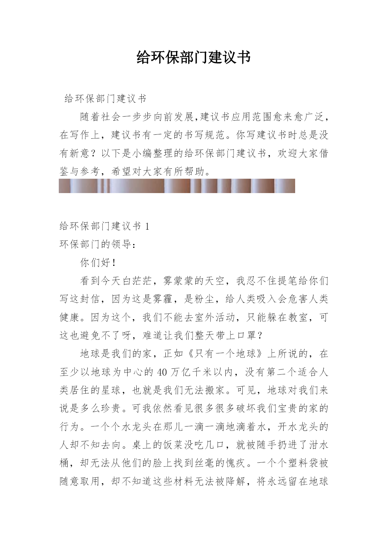 给环保部门建议书给环保部门建议书随着社会一步步向前发展,建议书应用范围愈来愈广泛,在写作上,建议书有一定的书写规范。你写建议书时总是没有新意?以下是小编整理的给环保部门建议书,欢迎大家借鉴与参考,希望对大家有所帮助。给环保部门建议书1环保部门的领导:你们好!看到今天白茫茫,雾蒙蒙的天空,我忍不住提笔给你们写这封信,因为这是雾霾,是粉尘,给人类吸入会危害人类健康。因为这个,我们不能去室外活动,只能躲在教室,可这也避免不了呀,难道让我们整天带上口罩?地球是我们的家,正如《只有一个地球》上所说的,在至少以地球为