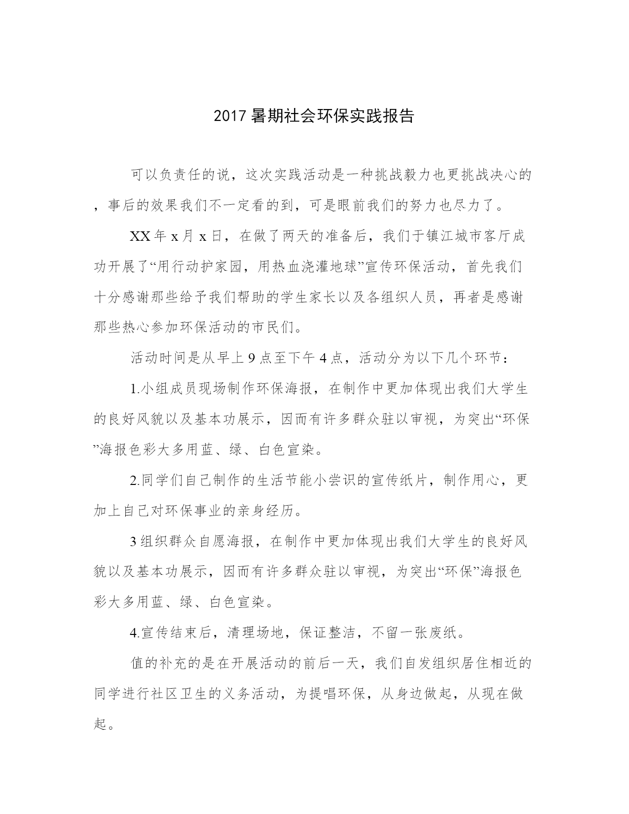 2017暑期社会环保实践报告可以负责任的说,这次实践活动是一种挑战毅力也更挑战决心的,事后的效果我们不一定看的到,可是眼前我们的努力也尽力了。XX年x月x日,在做了两天的准备后,我们于镇江城市客厅成功开展了“用行动护家园,用热血浇灌地球”宣传环保活动,首先我们十分感谢那些给予我们帮助的学生家长以及各组织人员,再者是感谢那些热心参加环保活动的市民们。活动时间是从早上9点至下午4点,活动分为以下几个环节:1.小组成员现场制作环保海报,在制作中更加体现出我们大学生的良好风貌以及基本功展示,因而有许多群众驻以审视