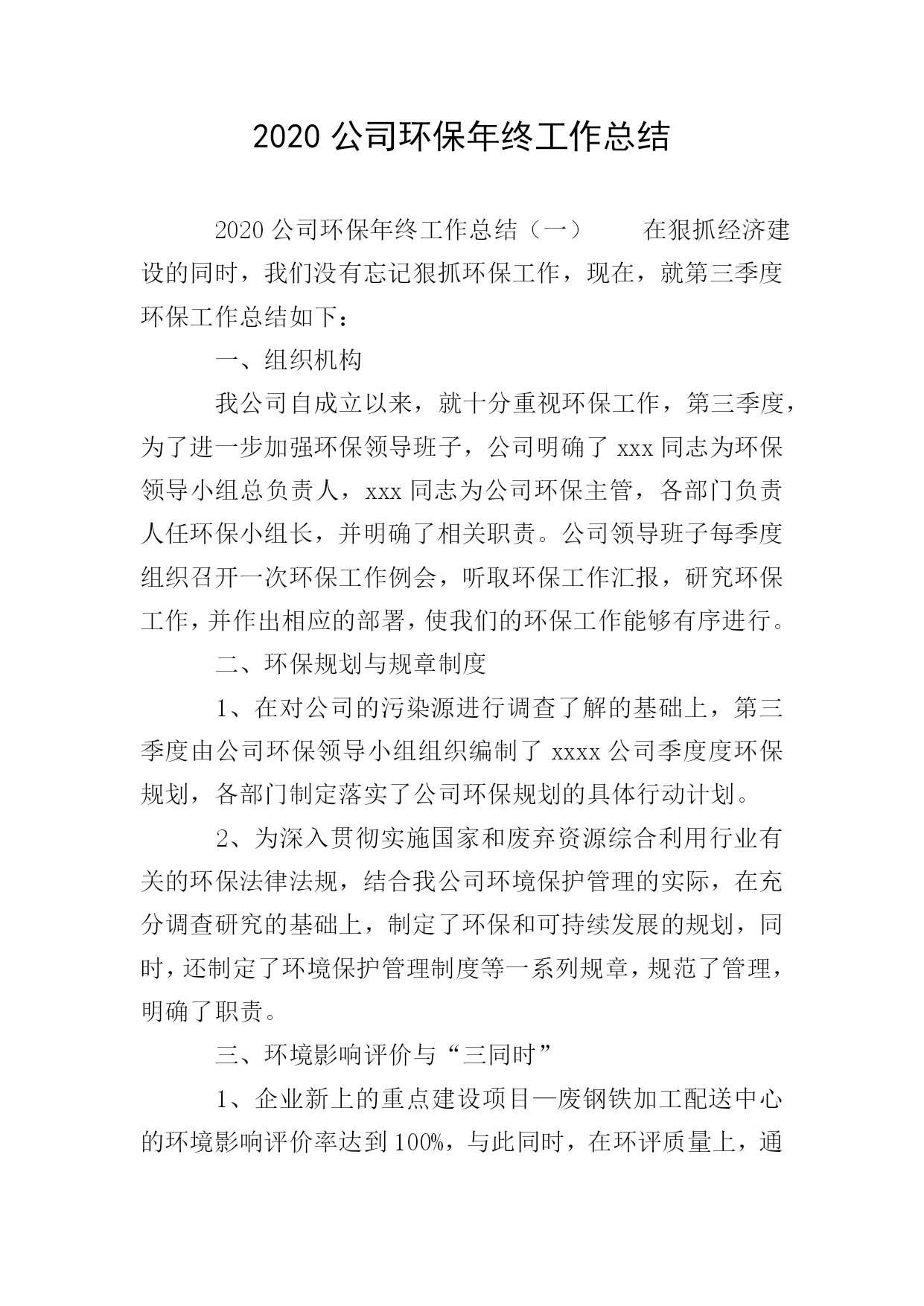 2020公司环保年终工作总结2020公司环保年终工作总结(一)在狠抓经济建设的同时,我们没有忘记狠抓环保工作,现在,就第三季度环保工作总结如下:一、组织机构我公司自成立以来,就十分重视环保工作,第三季度,为了进一步加强环保领导班子,公司明确了xxx同志为环保领导小组总负责人,xxx同志为公司环保主管,各部门负责人任环保小组长,并明确了相关职责。公司领导班子每季度组织召开一次环保工作例会,听取环保工作汇报,研究环保工作,并作出相应的部署,使我们的环保工作能够有序进行。二、环保规划与规章制度1、在对公司的污染