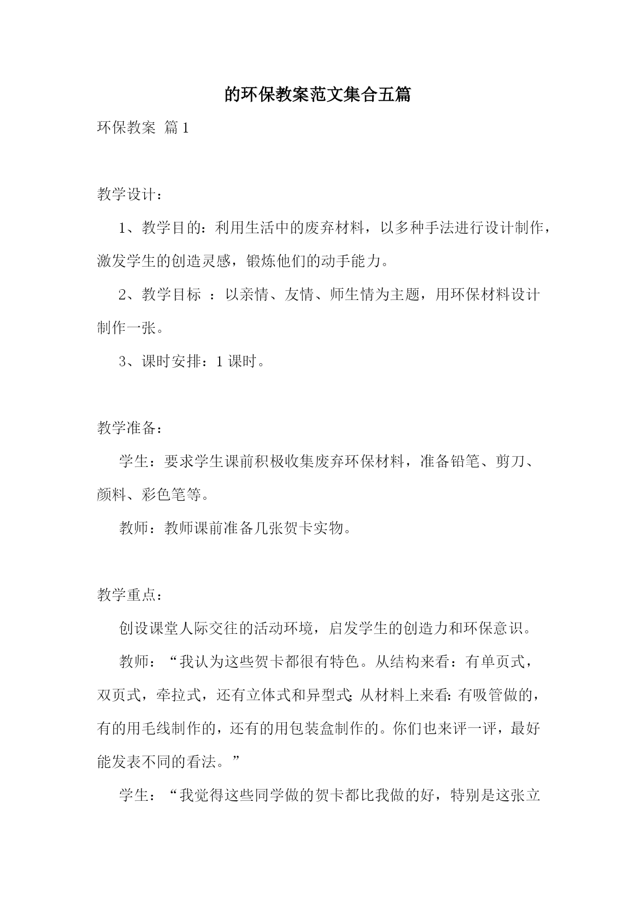 的环保教案范文集合五篇环保教案篇1教学设计:1、教学目的:利用生活中的废弃材料,以多种手法进行设计制作,激发学生的创造灵感,锻炼他们的动手能力。2、教学目标:以亲情、友情、师生情为主题,用环保材料设计制作一张。3、课时安排:1课时。教学准备:学生:要求学生课前积极收集废弃环保材料,准备铅笔、剪刀、颜料、彩色笔等。教师:教师课前准备几张贺卡实物。教学重点:创设课堂人际交往的活动环境,启发学生的创造力和环保意识。教师:“我认为这些贺卡都很有特色。从结构来看:有单页式,双页式,牵拉式,还有立体式和异型式;从材料