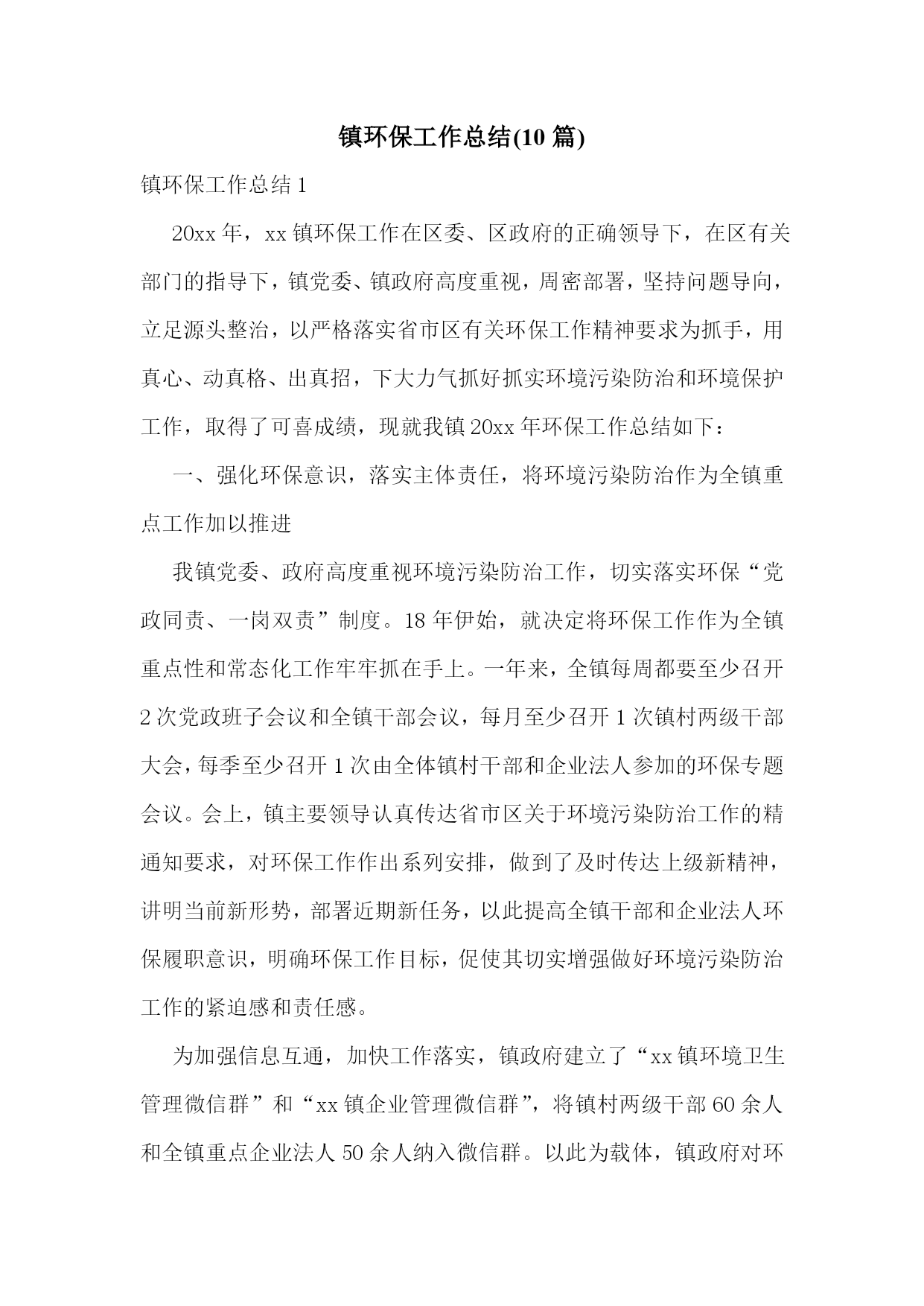 镇环保工作总结(10篇)镇环保工作总结120xx年,xx镇环保工作在区委、区政府的正确领导下,在区有关部门的指导下,镇党委、镇政府高度重视,周密部署,坚持问题导向,立足源头整治,以严格落实省市区有关环保工作精神要求为抓手,用真心、动真格、出真招,下大力气抓好抓实环境污染防治和环境保护工作,取得了可喜成绩,现就我镇20xx年环保工作总结如下:一、强化环保意识,落实主体责任,将环境污染防治作为全镇重点工作加以推进我镇党委、政府高度重视环境污染防治工作,切实落实环保“党政同责、一岗双责”制度。18年伊始,就决定