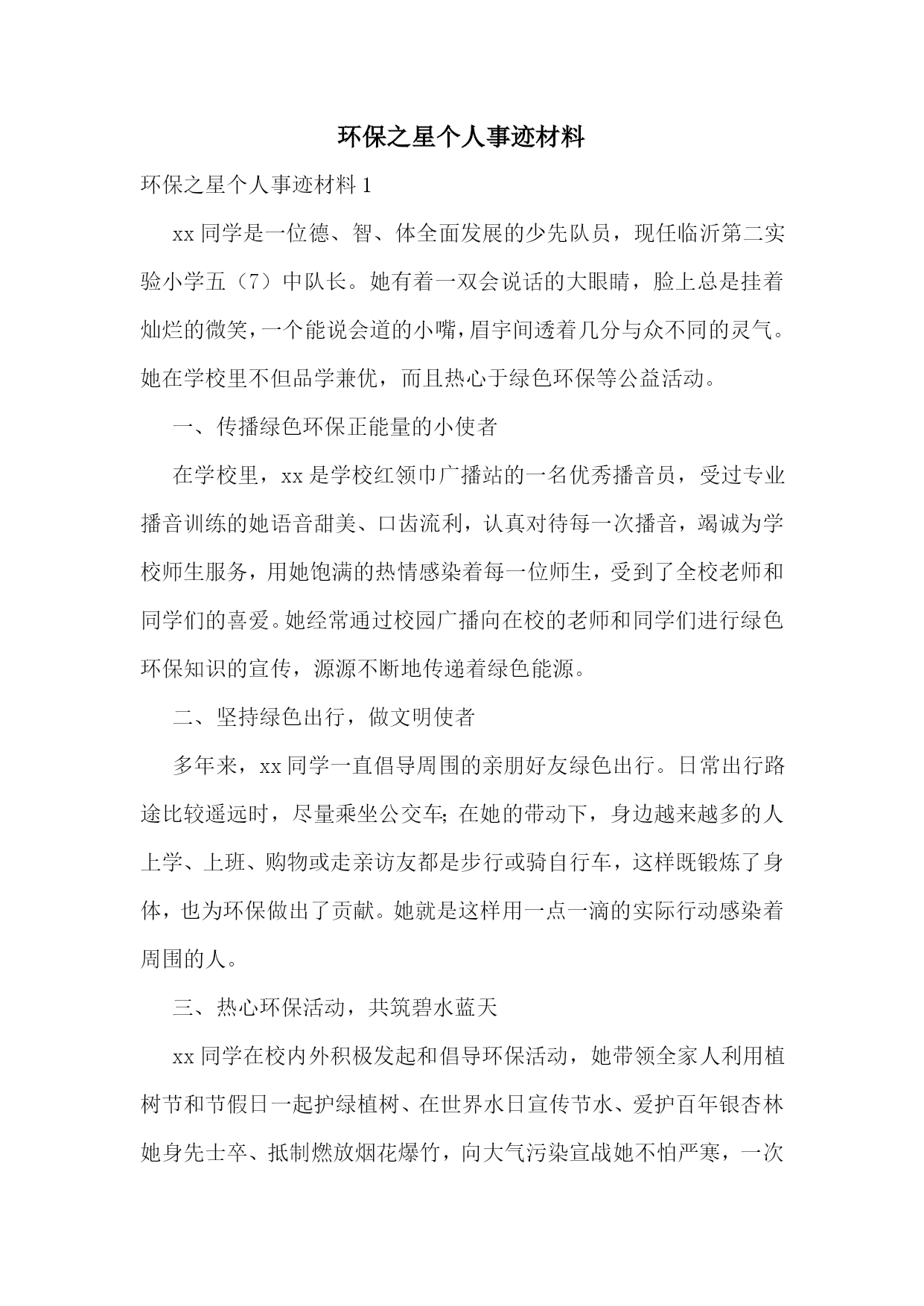 环保之星个人事迹材料环保之星个人事迹材料1xx同学是一位德、智、体全面发展的少先队员,现任临沂第二实验小学五(7)中队长。她有着一双会说话的大眼睛,脸上总是挂着灿烂的微笑,一个能说会道的小嘴,眉宇间透着几分与众不同的灵气。她在学校里不但品学兼优,而且热心于绿色环保等公益活动。一、传播绿色环保正能量的小使者在学校里,xx是学校红领巾广播站的一名优秀播音员,受过专业播音训练的她语音甜美、口齿流利,认真对待每一次播音,竭诚为学校师生服务,用她饱满的热情感染着每一位师生,受到了全校老师和同学们的喜爱。她经常通过校