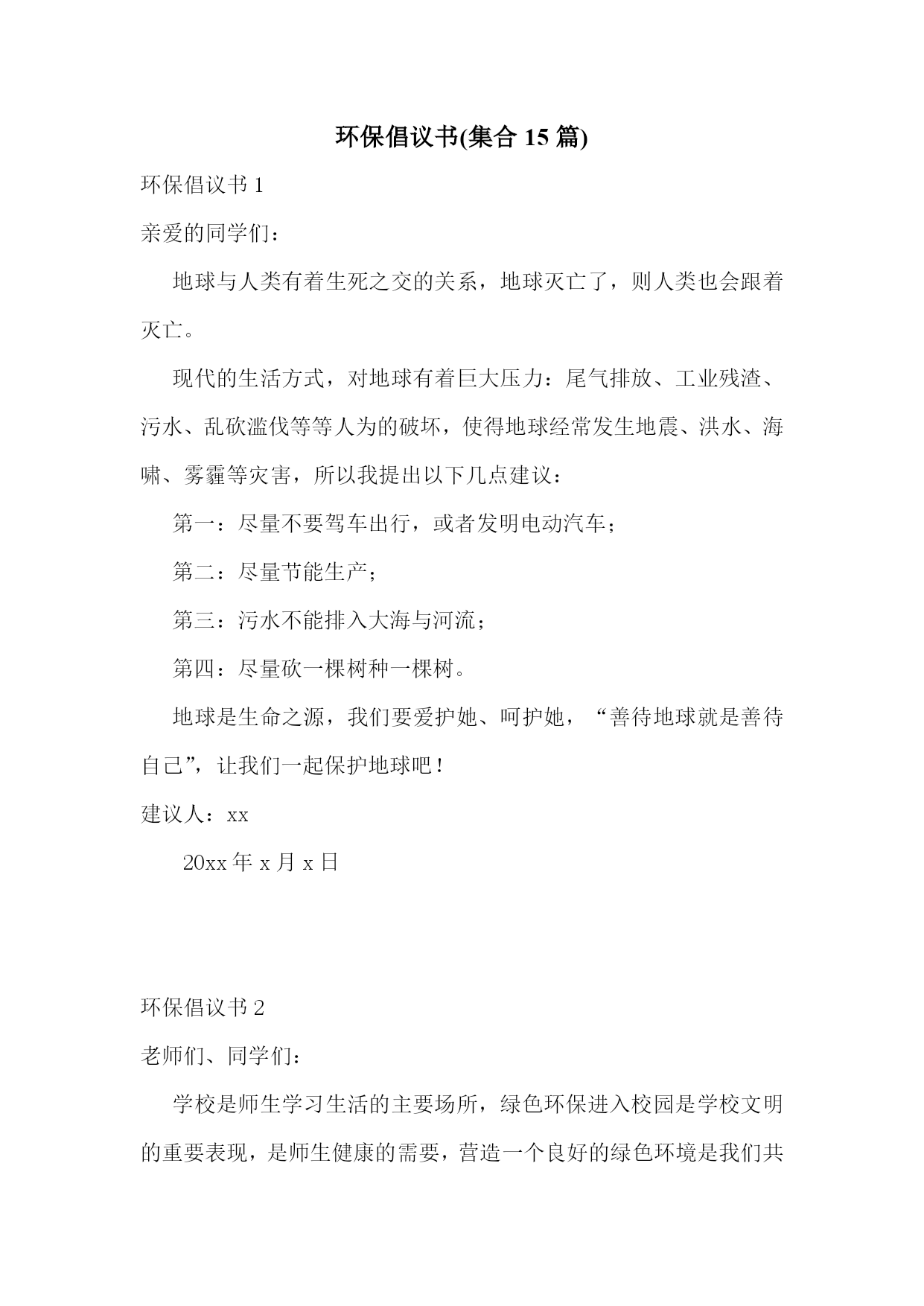 环保倡议书(集合15篇)环保倡议书1亲爱的同学们:地球与人类有着生死之交的关系,地球灭亡了,则人类也会跟着灭亡。现代的生活方式,对地球有着巨大压力:尾气排放、工业残渣、污水、乱砍滥伐等等人为的破坏,使得地球经常发生地震、洪水、海啸、雾霾等灾害,所以我提出以下几点建议:第一:尽量不要驾车出行,或者发明电动汽车;第二:尽量节能生产;第三:污水不能排入大海与河流;第四:尽量砍一棵树种一棵树。地球是生命之源,我们要爱护她、呵护她,“善待地球就是善待自己”,让我们一起保护地球吧!建议人:xx20xx年x月x日环保倡
