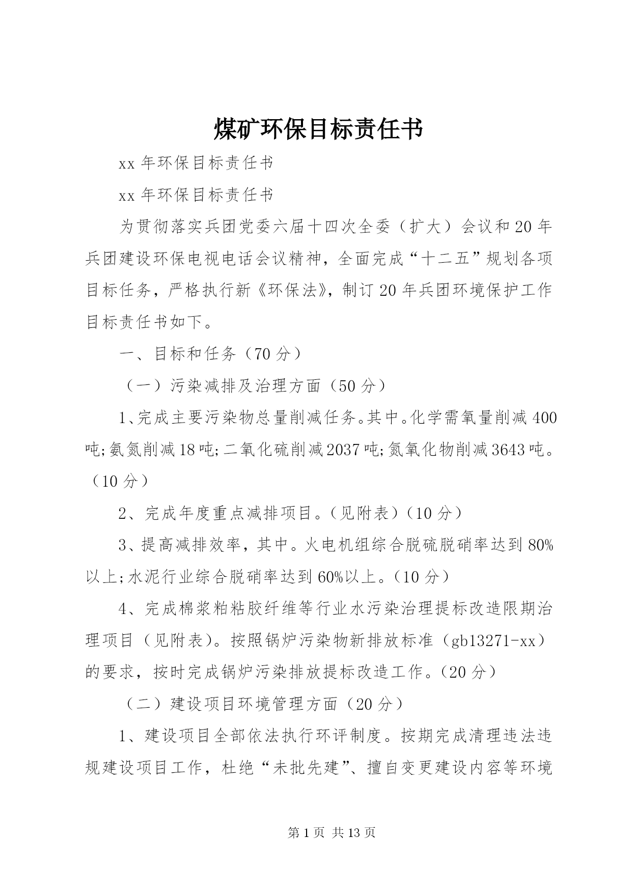 第PAGE\*Arabic\*MERGEFORMAT13页共NUMPAGES\*MERGEFORMAT13页煤矿环保目标责任书xx年环保目标责任书xx年环保目标责任书为贯彻落实兵团党委六届十四次全委(扩大)会议和20年兵团建设环保电视电话会议精神,全面完成“十二五”规划各项目标任务,严格执行新《环保法》,制订20年兵团环境保护工作目标责任书如下。一、目标和任务(70分)(一)污染减排及治理方面(50分)1、完成主要污染物总量削减任务。其中。化学需氧量削减400吨;氨氮削减18吨;二氧化硫削减2