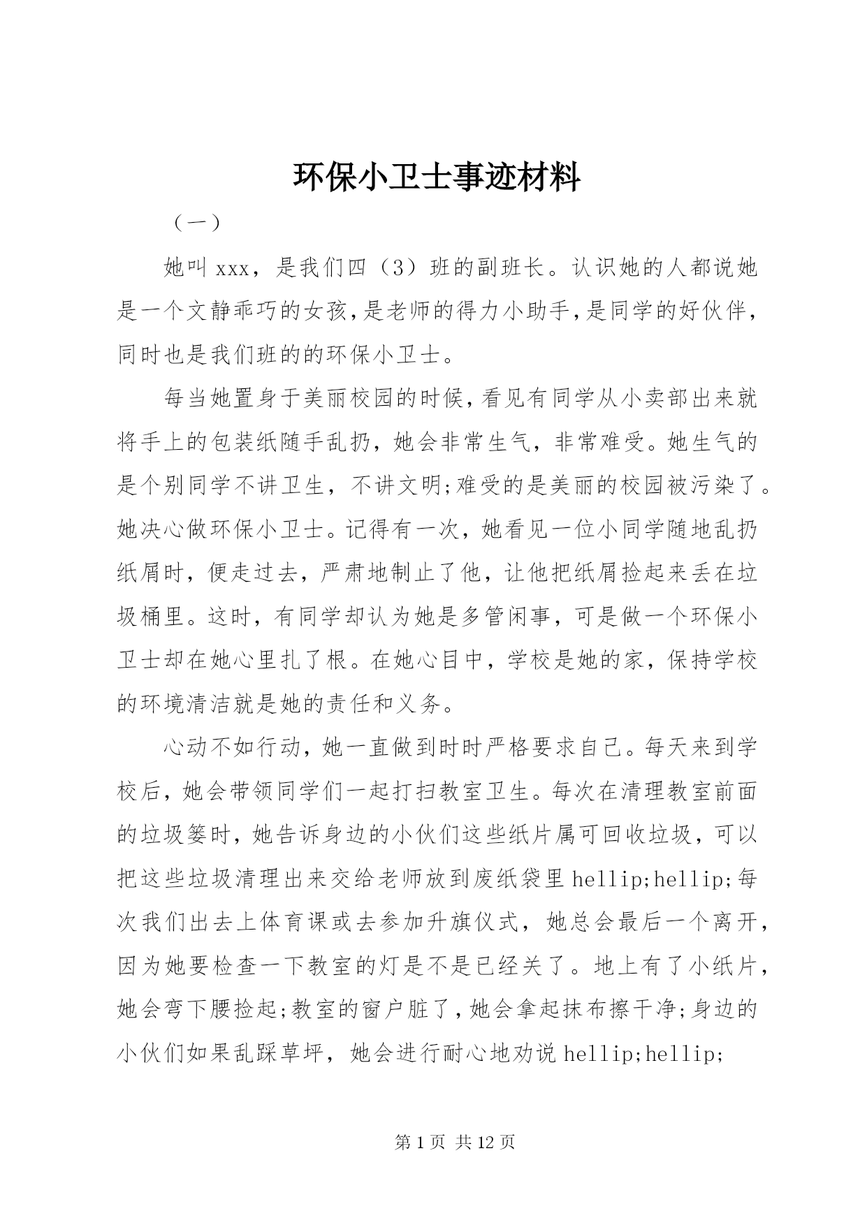 第PAGE\*Arabic\*MERGEFORMAT12页共NUMPAGES\*MERGEFORMAT12页环保小卫士事迹材料(一)她叫xxx,是我们四(3)班的副班长。认识她的人都说她是一个文静乖巧的女孩,是老师的得力小助手,是同学的好伙伴,同时也是我们班的的环保小卫士。每当她置身于美丽校园的时候,看见有同学从小卖部出来就将手上的包装纸随手乱扔,她会非常生气,非常难受。她生气的是个别同学不讲卫生,不讲文明;难受的是美丽的校园被污染了。她决心做环保小卫士。记得有一次,她看见一位小同学随地乱扔纸