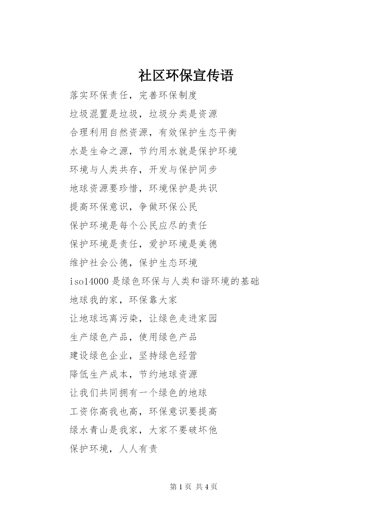 第PAGE\*Arabic\*MERGEFORMAT4页共NUMPAGES\*MERGEFORMAT4页社区环保宣传语落实环保责任,完善环保制度垃圾混置是垃圾,垃圾分类是资源合理利用自然资源,有效保护生态平衡水是生命之源,节约用水就是保护环境环境与人类共存,开发与保护同步地球资源要珍惜,环境保护是共识提高环保意识,争做环保公民保护环境是每个公民应尽的责任保护环境是责任,爱护环境是美德维护社会公德,保护生态环境iso14000是绿色环保与人类和谐环境的基础地球我的家,环保靠大家让地球远离污染,让