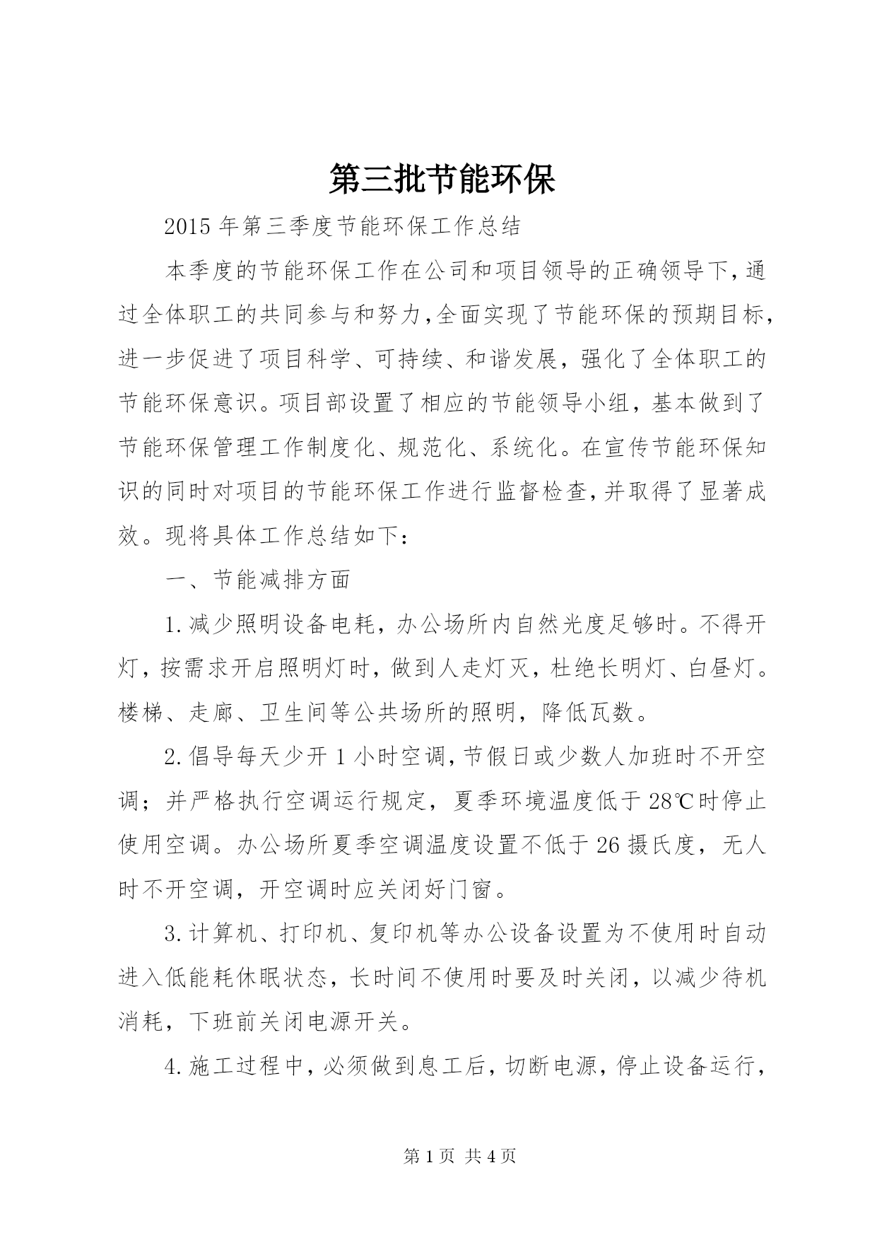 第PAGE\*Arabic\*MERGEFORMAT4页共NUMPAGES\*MERGEFORMAT4页第三批节能环保2015年第三季度节能环保工作总结本季度的节能环保工作在公司和项目领导的正确领导下,通过全体职工的共同参与和努力,全面实现了节能环保的预期目标,进一步促进了项目科学、可持续、和谐发展,强化了全体职工的节能环保意识。项目部设置了相应的节能领导小组,基本做到了节能环保管理工作制度化、规范化、系统化。在宣传节能环保知识的同时对项目的节能环保工作进行监督检查,并取得了显著成效。现将具体
