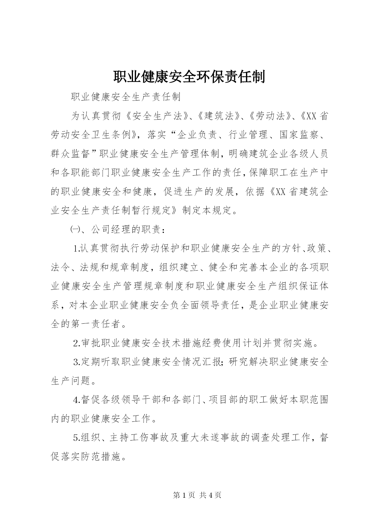 第PAGE\*Arabic\*MERGEFORMAT4页共NUMPAGES\*MERGEFORMAT4页职业健康安全环保责任制职业健康安全生产责任制为认真贯彻《安全生产法》、《建筑法》、《劳动法》、《XX省劳动安全卫生条例》,落实“企业负责、行业管理、国家监察、群众监督”职业健康安全生产管理体制,明确建筑企业各级人员和各职能部门职业健康安全生产工作的责任,保障职工在生产中的职业健康安全和健康,促进生产的发展,依据《XX省建筑企业安全生产责任制暂行规定》制定本规定。㈠、公司经理的职责:⒈认真贯彻