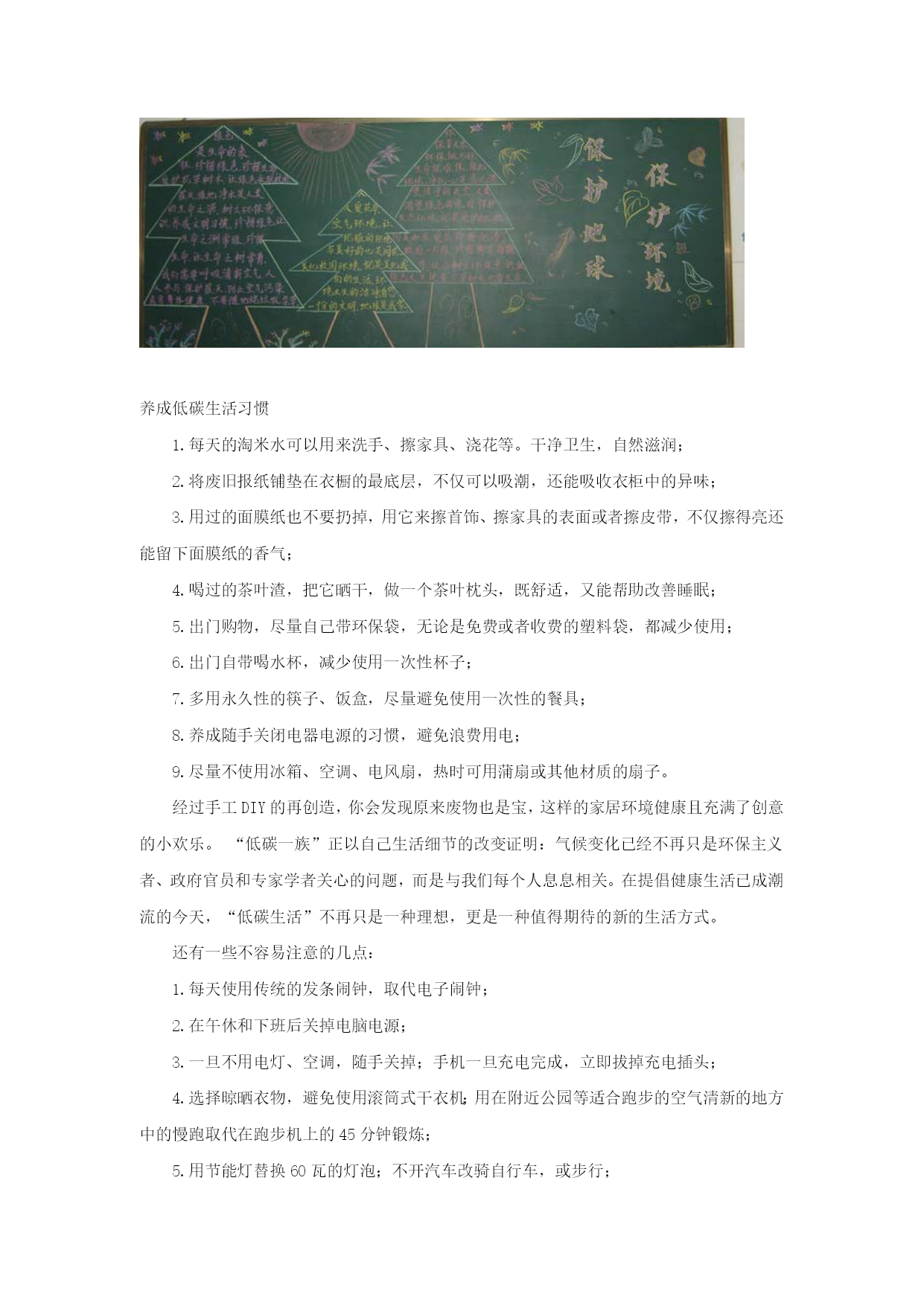 养成低碳生活习惯1.每天的淘米水可以用来洗手、擦家具、浇花等。干净卫生,自然滋润;2.将废旧报纸铺垫在衣橱的最底层,不仅可以吸潮,还能吸收衣柜中的异味;3.用过的面膜纸也不要扔掉,用它来擦首饰、擦家具的表面或者擦皮带,不仅擦得亮还能留下面膜纸的香气;4.喝过的茶叶渣,把它晒干,做一个茶叶枕头,既舒适,又能帮助改善睡眠;5.出门购物,尽量自己带环保袋,无论是免费或者收费的塑料袋,都减少使用;6.出门自带喝水杯,减少使用一次性杯子;7.多用永久性的筷子、饭盒,尽量避免使用一次性的餐具;8.养成随手关闭电器电源