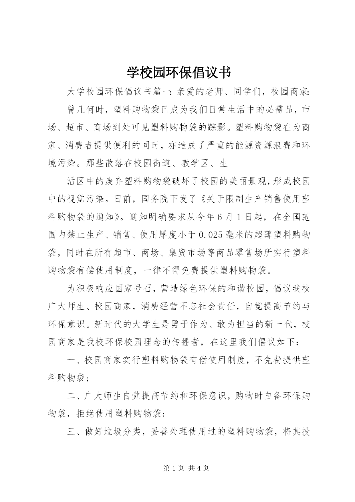 第PAGE\*Arabic\*MERGEFORMAT4页共NUMPAGES\*MERGEFORMAT4页学校园环保倡议书大学校园环保倡议书篇一:亲爱的老师、同学们,校园商家:曾几何时,塑料购物袋已成为我们日常生活中的必需品,市场、超市、商场到处可见塑料购物袋的踪影。塑料购物袋在为商家、消费者提供便利的同时,亦造成了严重的能源资源浪费和环境污染。那些散落在校园街道、教学区、生活区中的废弃塑料购物袋破坏了校园的美丽景观,形成校园中的视觉污染。日前,国务院下发了《关于限制生产销售使用塑料购物袋的通知