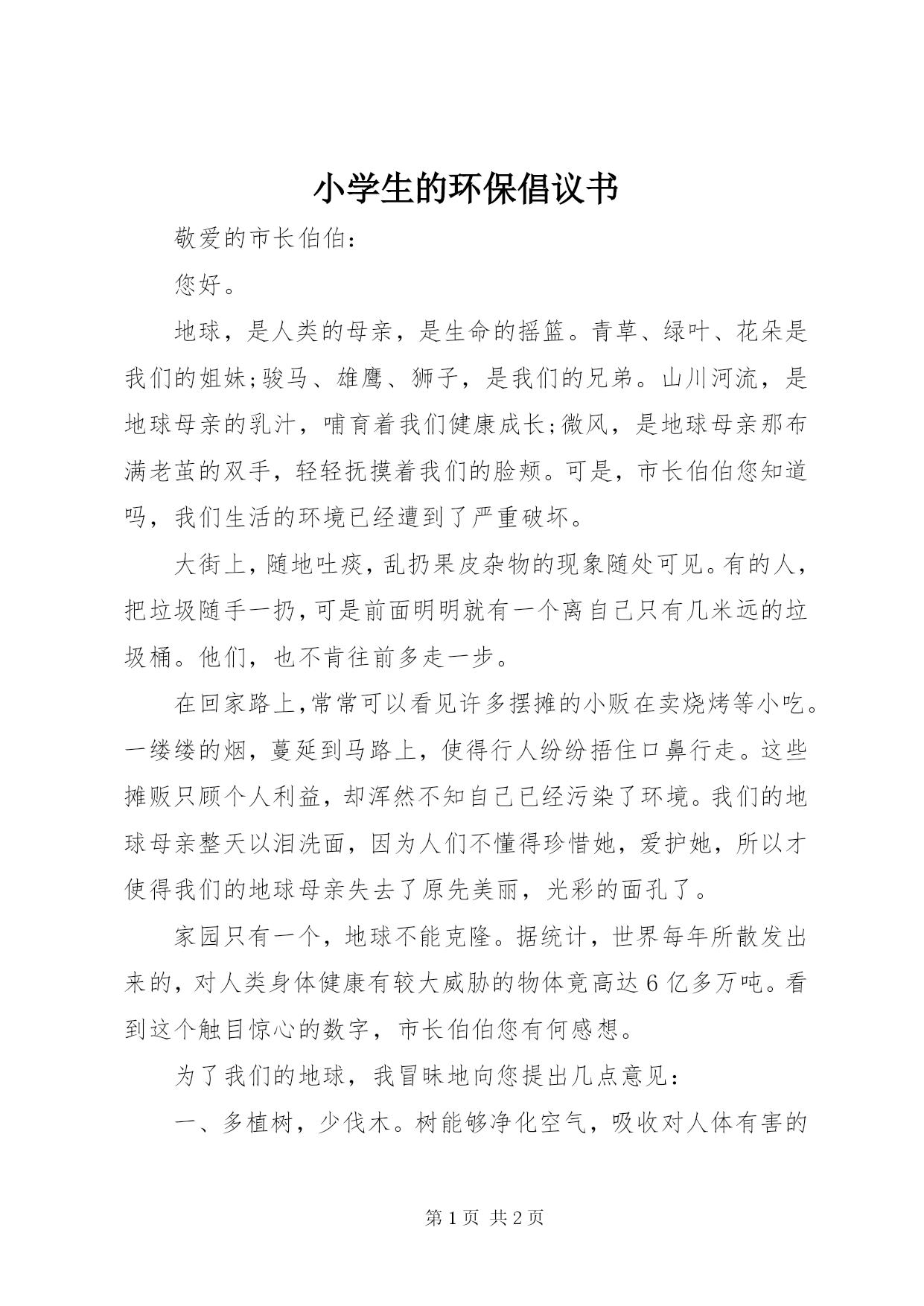 第PAGE\*Arabic\*MERGEFORMAT2页共NUMPAGES\*MERGEFORMAT2页小学生的环保倡议书敬爱的市长伯伯:您好。地球,是人类的母亲,是生命的摇篮。青草、绿叶、花朵是我们的姐妹;骏马、雄鹰、狮子,是我们的兄弟。山川河流,是地球母亲的乳汁,哺育着我们健康成长;微风,是地球母亲那布满老茧的双手,轻轻抚摸着我们的脸颊。可是,市长伯伯您知道吗,我们生活的环境已经遭到了严重破坏。大街上,随地吐痰,乱扔果皮杂物的现象随处可见。有的人,把垃圾随手一扔,可是前面明明就有一个离自己