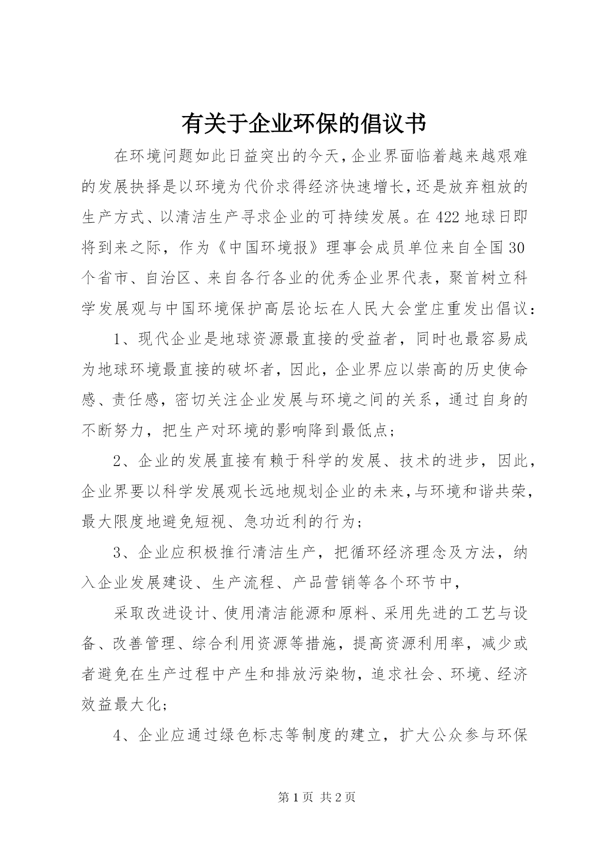 第PAGE\*Arabic\*MERGEFORMAT2页共NUMPAGES\*MERGEFORMAT2页有关于企业环保的倡议书在环境问题如此日益突出的今天,企业界面临着越来越艰难的发展抉择是以环境为代价求得经济快速增长,还是放弃粗放的生产方式、以清洁生产寻求企业的可持续发展。在422地球日即将到来之际,作为《中国环境报》理事会成员单位来自全国30个省市、自治区、来自各行各业的优秀企业界代表,聚首树立科学发展观与中国环境保护高层论坛在人民大会堂庄重发出倡议:1、现代企业是地球资源最直接的受益者,