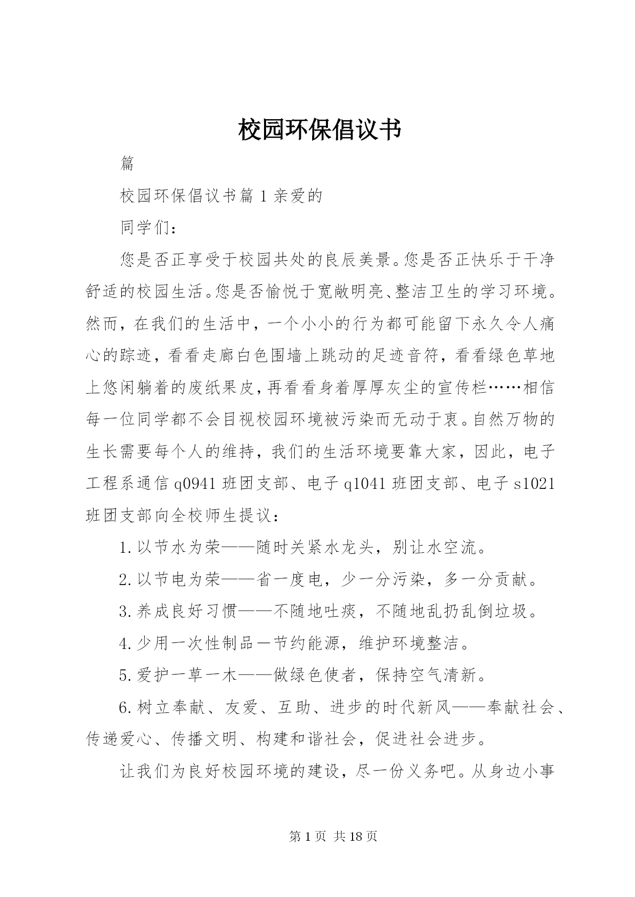 第PAGE\*Arabic\*MERGEFORMAT18页共NUMPAGES\*MERGEFORMAT18页校园环保倡议书篇校园环保倡议书篇1亲爱的同学们:您是否正享受于校园共处的良辰美景。您是否正快乐于干净舒适的校园生活。您是否愉悦于宽敞明亮、整洁卫生的学习环境。然而,在我们的生活中,一个小小的行为都可能留下永久令人痛心的踪迹,看看走廊白色围墙上跳动的足迹音符,看看绿色草地上悠闲躺着的废纸果皮,再看看身着厚厚灰尘的宣传栏……相信每一位同学都不会目视校园环境被污染而无动于衷。自然万物的生长需要