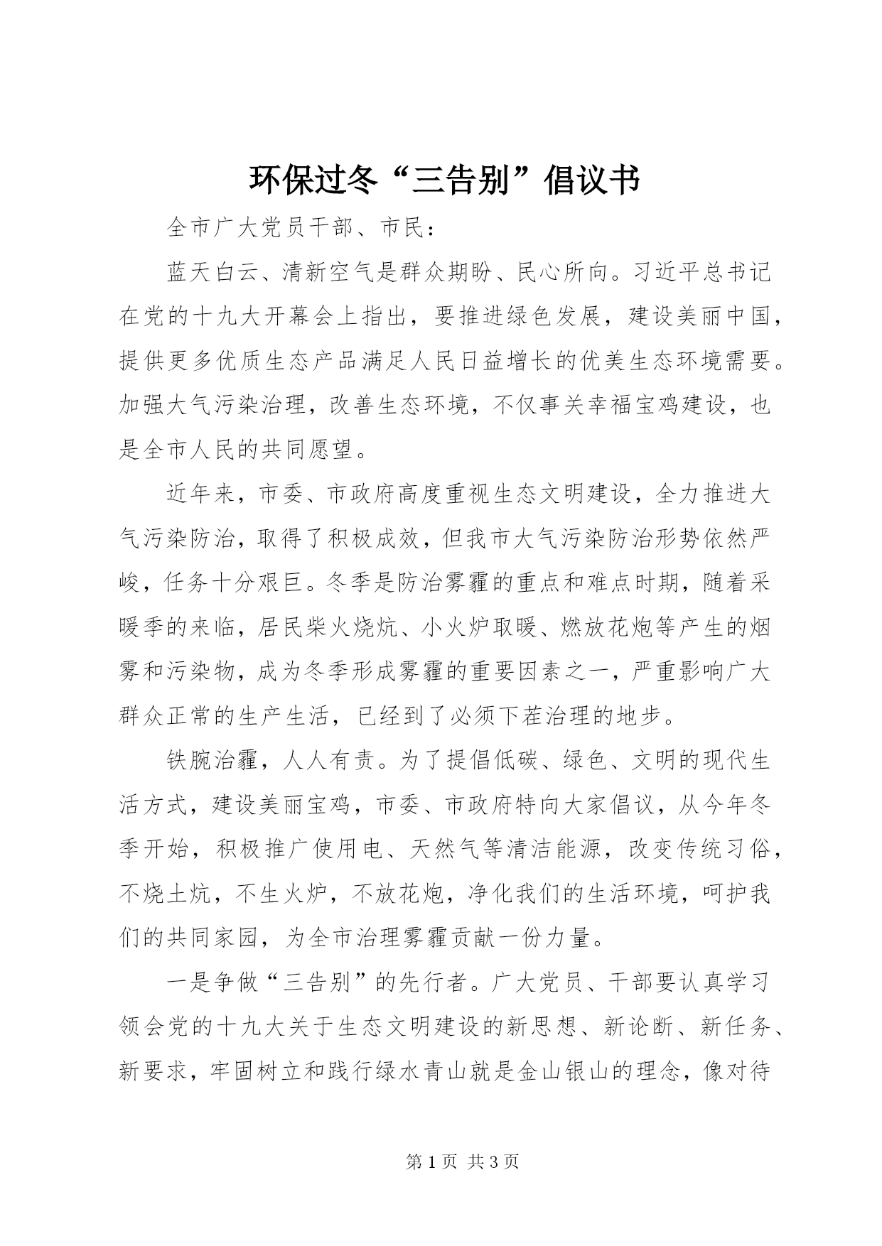 第PAGE\*Arabic\*MERGEFORMAT3页共NUMPAGES\*MERGEFORMAT3页环保过冬“三告别”倡议书全市广大党员干部、市民:蓝天白云、清新空气是群众期盼、民心所向。习近平总书记在党的十九大开幕会上指出,要推进绿色发展,建设美丽中国,提供更多优质生态产品满足人民日益增长的优美生态环境需要。加强大气污染治理,改善生态环境,不仅事关幸福宝鸡建设,也是全市人民的共同愿望。近年来,市委、市政府高度重视生态文明建设,全力推进大气污染防治,取得了积极成效,但我市大气污染防治形势依