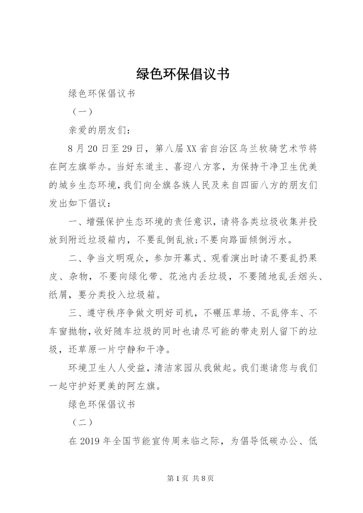 第PAGE\*Arabic\*MERGEFORMAT8页共NUMPAGES\*MERGEFORMAT8页绿色环保倡议书绿色环保倡议书(一)亲爱的朋友们:8月20日至29日,第八届XX省自治区乌兰牧骑艺术节将在阿左旗举办。当好东道主、喜迎八方客,为保持干净卫生优美的城乡生态环境,我们向全旗各族人民及来自四面八方的朋友们发出如下倡议:一、增强保护生态环境的责任意识,请将各类垃圾收集并投放到附近垃圾箱内,不要乱倒乱放;不要向路面倾倒污水。二、争当文明观众,参加开幕式、观看演出时请不要乱扔果皮、杂物,