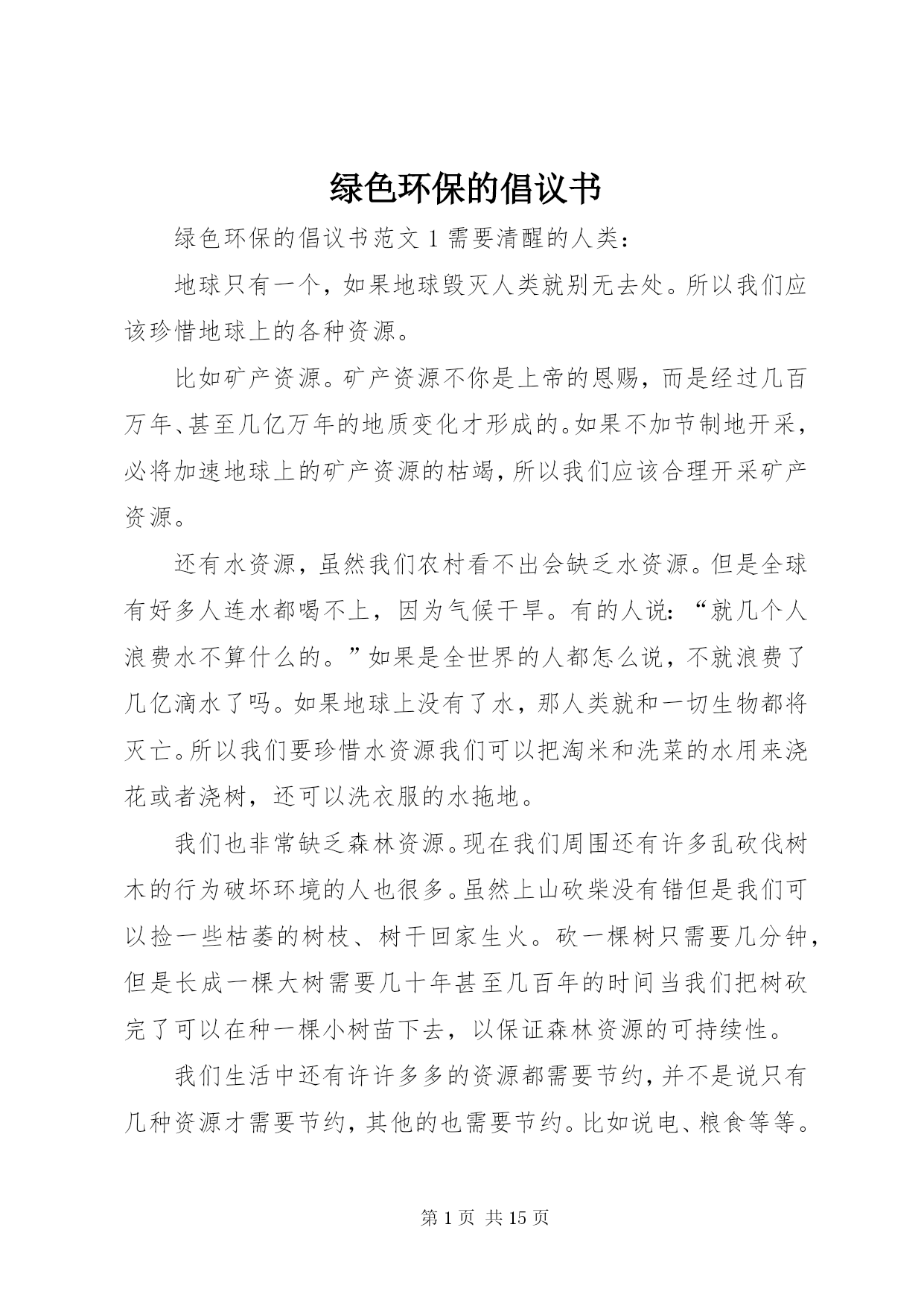 第PAGE\*Arabic\*MERGEFORMAT15页共NUMPAGES\*MERGEFORMAT15页绿色环保的倡议书绿色环保的倡议书范文1需要清醒的人类:地球只有一个,如果地球毁灭人类就别无去处。所以我们应该珍惜地球上的各种资源。比如矿产资源。矿产资源不你是上帝的恩赐,而是经过几百万年、甚至几亿万年的地质变化才形成的。如果不加节制地开采,必将加速地球上的矿产资源的枯竭,所以我们应该合理开采矿产资源。还有水资源,虽然我们农村看不出会缺乏水资源。但是全球有好多人连水都喝不上,因为气候干旱。