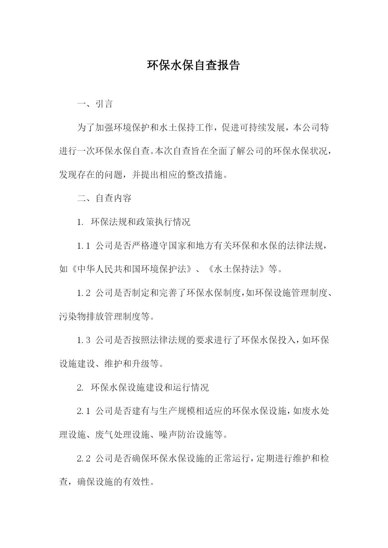环保水保自查报告一、引言为了加强环境保护和水土保持工作,促进可持续发展,本公司特进行一次环保水保自查。本次自查旨在全面了解公司的环保水保状况,发现存在的问题,并提出相应的整改措施。二、自查内容1.环保法规和政策执行情况1.1公司是否严格遵守国家和地方有关环保和水保的法律法规,如《中华人民共和国环境保护法》、《水土保持法》等。1.2公司是否制定和完善了环保水保制度,如环保设施管理制度、污染物排放管理制度等。1.3公司是否按照法律法规的要求进行了环保水保投入,如环保设施建设、维护和升级等。2.环保水保设施建设
