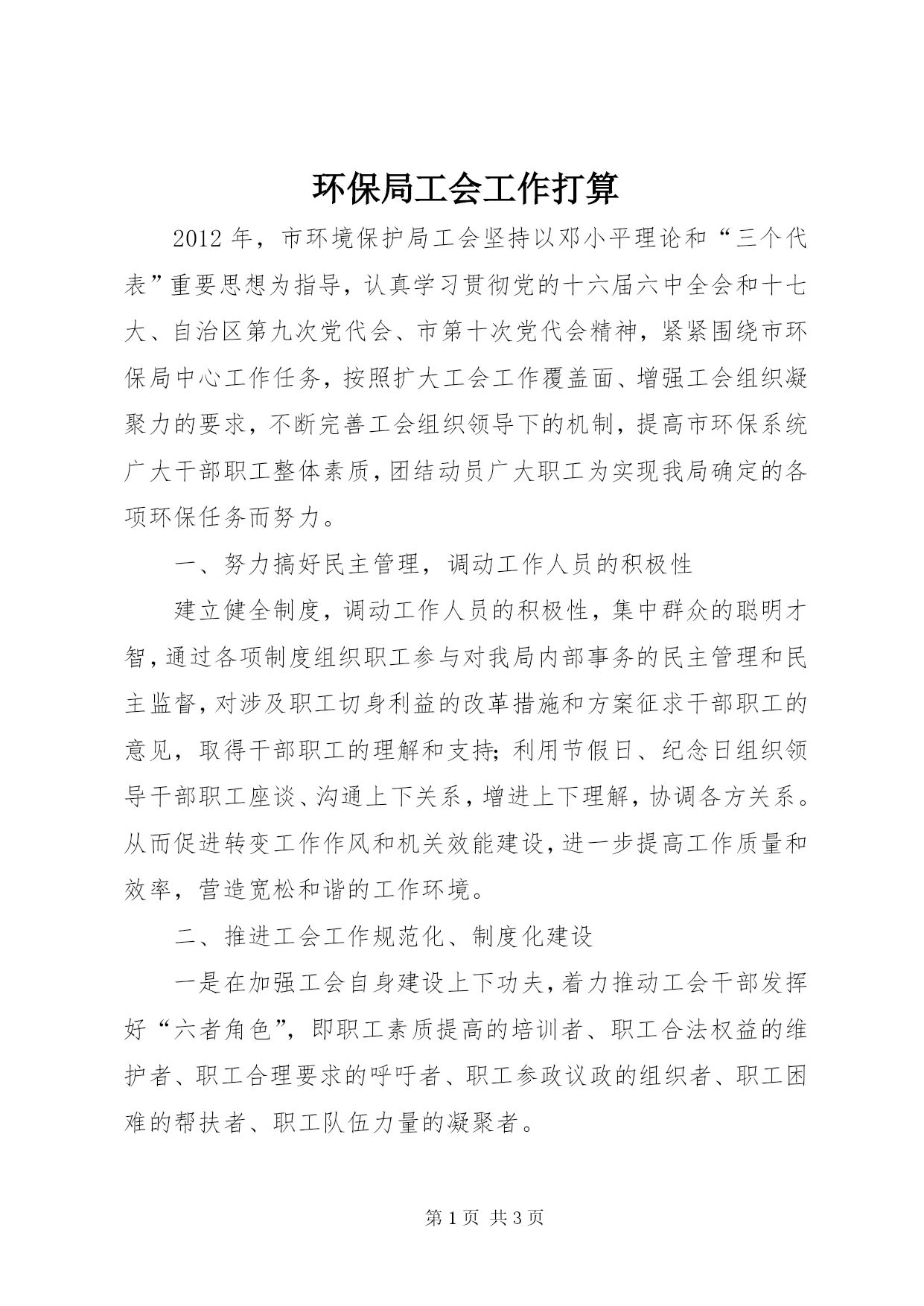 第PAGE\*Arabic\*MERGEFORMAT3页共NUMPAGES\*MERGEFORMAT3页环保局工会工作打算2012年,市环境保护局工会坚持以邓小平理论和“三个代表”重要思想为指导,认真学习贯彻党的十六届六中全会和十七大、自治区第九次党代会、市第十次党代会精神,紧紧围绕市环保局中心工作任务,按照扩大工会工作覆盖面、增强工会组织凝聚力的要求,不断完善工会组织领导下的机制,提高市环保系统广大干部职工整体素质,团结动员广大职工为实现我局确定的各项环保任务而努力。一、努力搞好民主管理,调