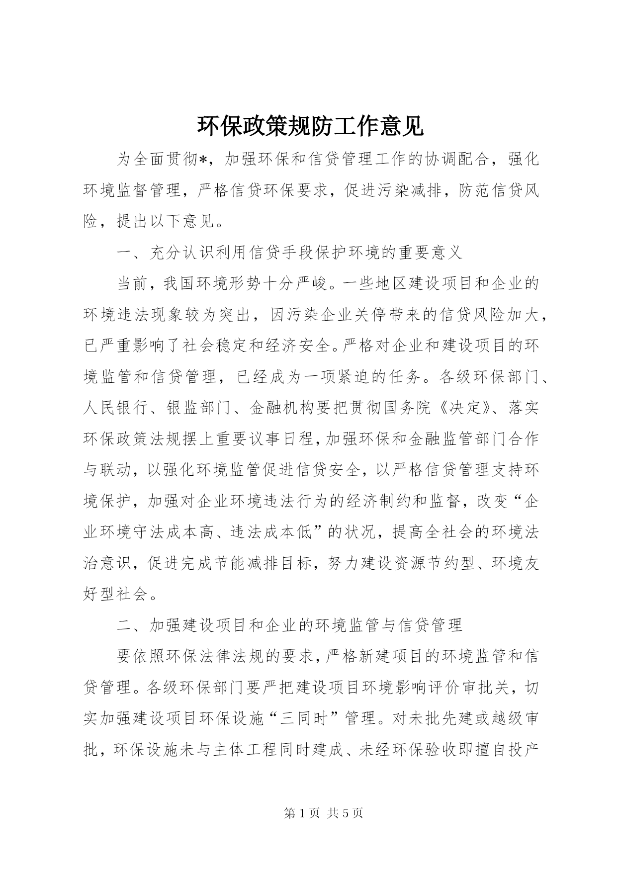 第PAGE\*Arabic\*MERGEFORMAT5页共NUMPAGES\*MERGEFORMAT5页环保政策规防工作意见为全面贯彻*,加强环保和信贷管理工作的协调配合,强化环境监督管理,严格信贷环保要求,促进污染减排,防范信贷风险,提出以下意见。一、充分认识利用信贷手段保护环境的重要意义当前,我国环境形势十分严峻。一些地区建设项目和企业的环境违法现象较为突出,因污染企业关停带来的信贷风险加大,已严重影响了社会稳定和经济安全。严格对企业和建设项目的环境监管和信贷管理,已经成为一项紧迫的任务。