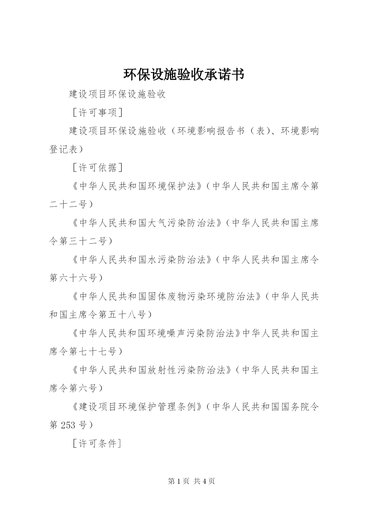 第PAGE\*Arabic\*MERGEFORMAT4页共NUMPAGES\*MERGEFORMAT4页环保设施验收承诺书建设项目环保设施验收[许可事项]建设项目环保设施验收(环境影响报告书(表)、环境影响登记表)[许可依据]《中华人民共和国环境保护法》(中华人民共和国主席令第二十二号)《中华人民共和国大气污染防治法》(中华人民共和国主席令第三十二号)《中华人民共和国水污染防治法》(中华人民共和国主席令第六十六号)《中华人民共和国固体废物污染环境防治法》(中华人民共和国主席令第五十八号)《中华
