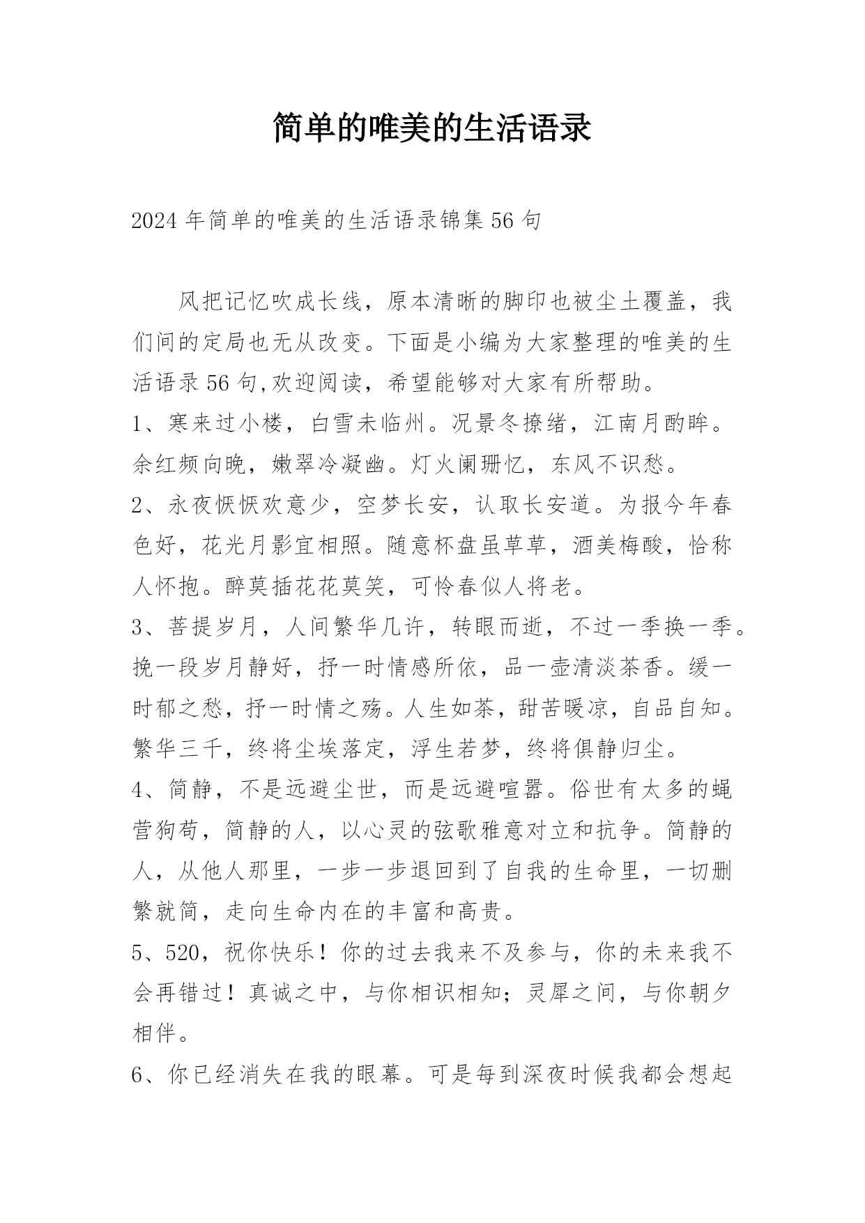 简单的唯美的生活语录2024年简单的唯美的生活语录锦集56句风把记忆吹成长线,原本清晰的脚印也被尘土覆盖,我们间的定局也无从改变。下面是小编为大家整理的唯美的生活语录56句,欢迎阅读,希望能够对大家有所帮助。1、寒来过小楼,白雪未临州。况景冬撩绪,江南月酌眸。余红频向晚,嫩翠冷凝幽。灯火阑珊忆,东风不识愁。2、永夜恹恹欢意少,空梦长安,认取长安道。为报今年春色好,花光月影宜相照。随意杯盘虽草草,酒美梅酸,恰称人怀抱。醉莫插花花莫笑,可怜春似人将老。3、菩提岁月,人间繁华几许,转眼而逝,不过一季换一季。挽一
