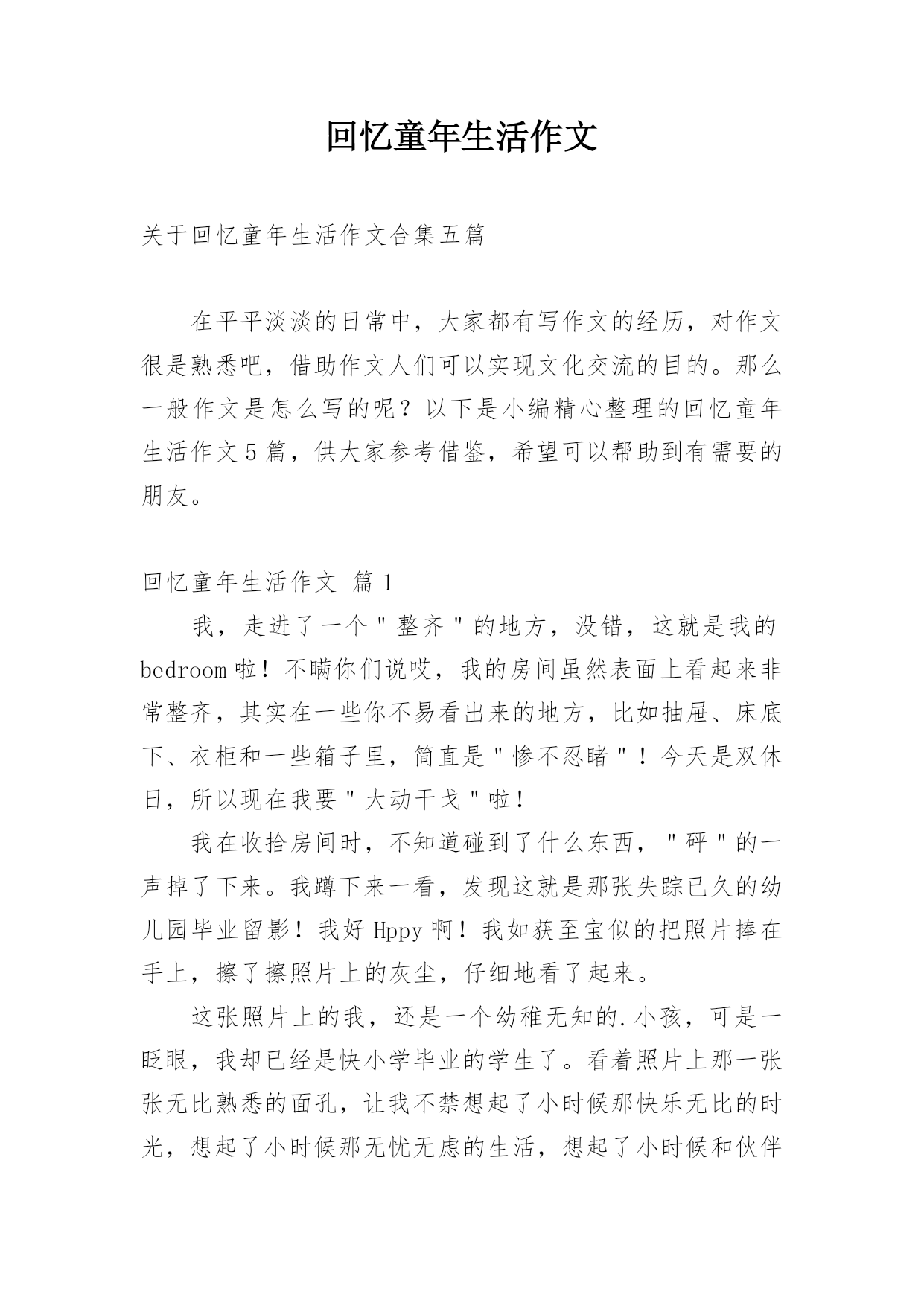 回忆童年生活作文关于回忆童年生活作文合集五篇在平平淡淡的日常中,大家都有写作文的经历,对作文很是熟悉吧,借助作文人们可以实现文化交流的目的。那么一般作文是怎么写的呢?以下是小编精心整理的回忆童年生活作文5篇,供大家参考借鉴,希望可以帮助到有需要的朋友。回忆童年生活作文篇1我,走进了一个"整齐"的地方,没错,这就是我的bedroom啦!不瞒你们说哎,我的房间虽然表面上看起来非常整齐,其实在一些你不易看出来的地方,比如抽屉、床底下、衣柜和一些箱子里,简直是"惨不忍睹"!今天是双休日,所以现在我要"大动干戈"啦