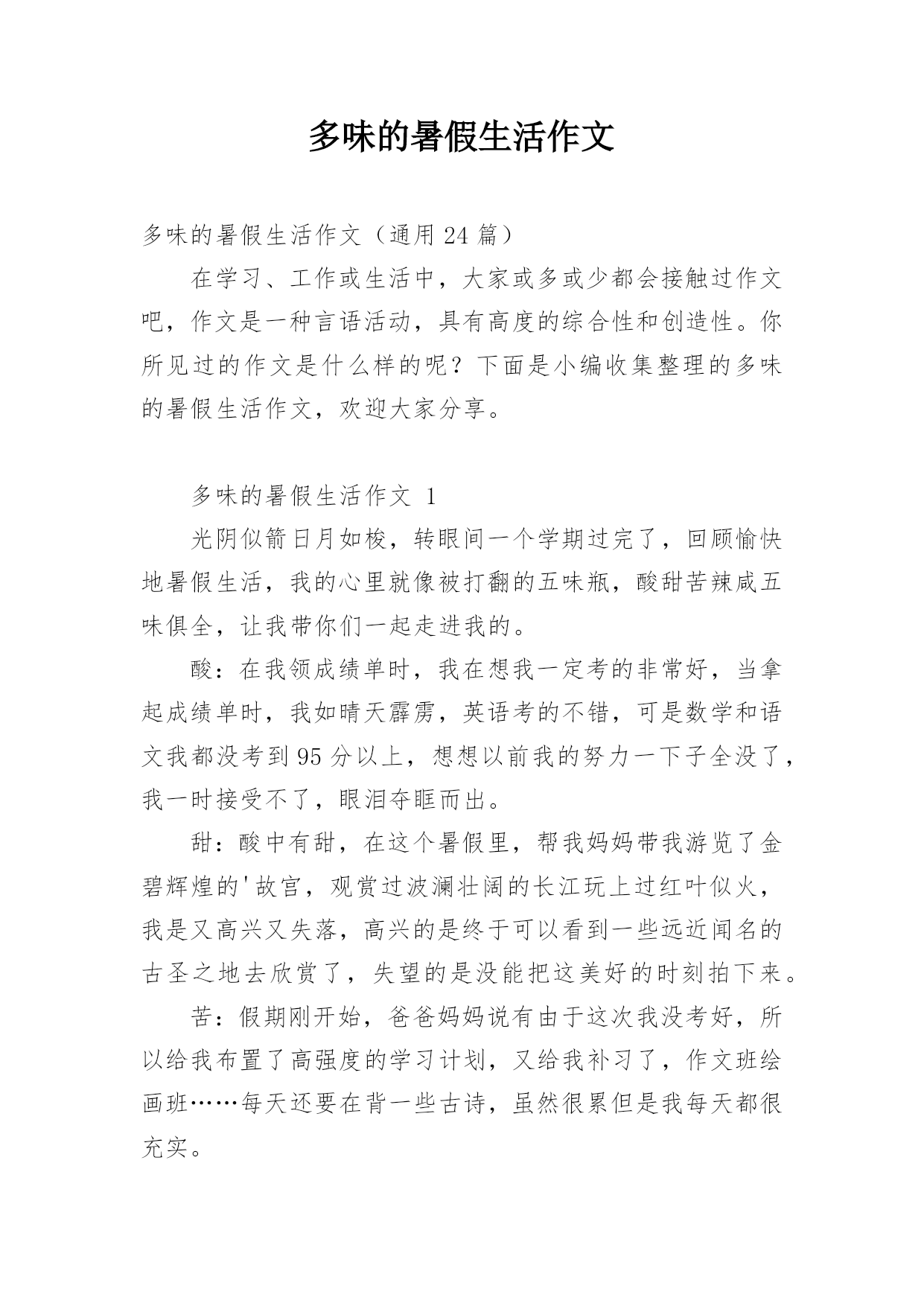 多味的暑假生活作文多味的暑假生活作文(通用24篇)在学习、工作或生活中,大家或多或少都会接触过作文吧,作文是一种言语活动,具有高度的综合性和创造性。你所见过的作文是什么样的呢?下面是小编收集整理的多味的暑假生活作文,欢迎大家分享。多味的暑假生活作文1光阴似箭日月如梭,转眼间一个学期过完了,回顾愉快地暑假生活,我的心里就像被打翻的五味瓶,酸甜苦辣咸五味俱全,让我带你们一起走进我的。酸:在我领成绩单时,我在想我一定考的非常好,当拿起成绩单时,我如晴天霹雳,英语考的不错,可是数学和语文我都没考到95分以上,想想