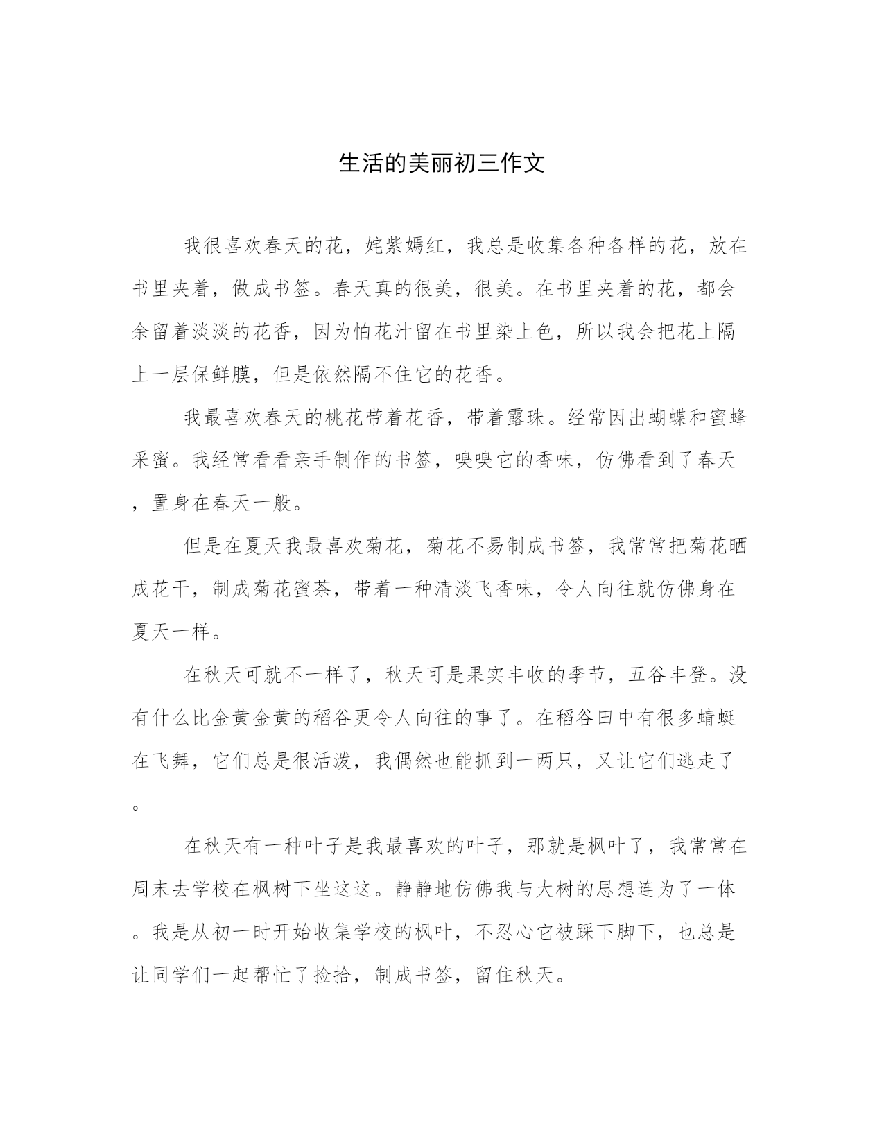 生活的美丽初三作文我很喜欢春天的花,姹紫嫣红,我总是收集各种各样的花,放在书里夹着,做成书签。春天真的很美,很美。在书里夹着的花,都会余留着淡淡的花香,因为怕花汁留在书里染上色,所以我会把花上隔上一层保鲜膜,但是依然隔不住它的花香。我最喜欢春天的桃花带着花香,带着露珠。经常因出蝴蝶和蜜蜂采蜜。我经常看看亲手制作的书签,嗅嗅它的香味,仿佛看到了春天,置身在春天一般。但是在夏天我最喜欢菊花,菊花不易制成书签,我常常把菊花晒成花干,制成菊花蜜茶,带着一种清淡飞香味,令人向往就仿佛身在夏天一样。在秋天可就不一样了