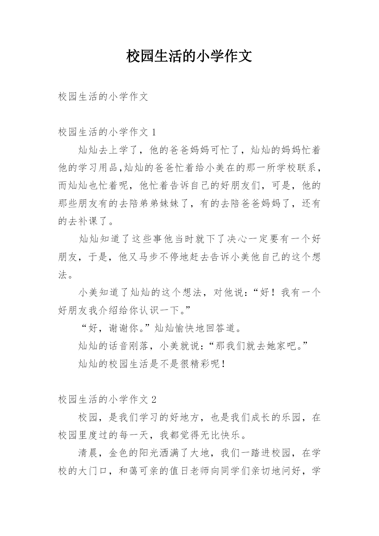 校园生活的小学作文校园生活的小学作文校园生活的小学作文1灿灿去上学了,他的爸爸妈妈可忙了,灿灿的妈妈忙着他的学习用品,灿灿的爸爸忙着给小美在的那一所学校联系,而灿灿也忙着呢,他忙着告诉自己的好朋友们,可是,他的那些朋友有的去陪弟弟妹妹了,有的去陪爸爸妈妈了,还有的去补课了。灿灿知道了这些事他当时就下了决心一定要有一个好朋友,于是,他又马步不停地赶去告诉小美他自己的这个想法。小美知道了灿灿的这个想法,对他说:“好!我有一个好朋友我介绍给你认识一下。”“好,谢谢你。”灿灿愉快地回答道。灿灿的话音刚落,小美就说